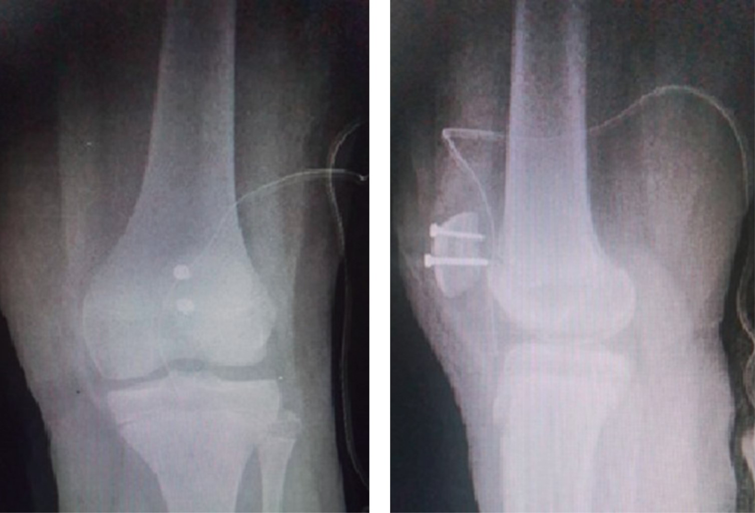 Se realizaron radiografías anteroposterior y lateral de rodilla izquierda 1 que mostraron leve aumento de los tejidos blandos, con presencia de fractura a nivel de la patela, con trazo simple coronal, fragmento desplazado hacia proximal y lateral que da la apariencia de doble rótula. Se decidió su ingreso para protocolo y tratamiento quirúrgico (Figura 1).