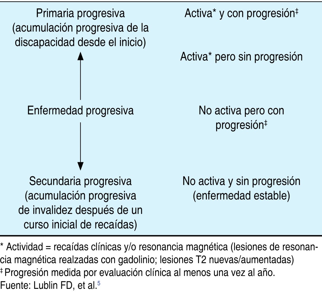 La clasificación de esclerosis múltiple ha sido establecida por Lublin en 19961 y revisada en 2013. La revisión incluye; síndrome clínico aislado, síndrome radiológico aislado, EM remitente-recurrente, primaria progresiva y secundaria progresiva. Finalmente se agregó el criterio de actividad (es decir, aparición de nuevas lesiones en resonancia magnética o recaídas clínicas) como calificador y progresión de la enfermedad, esto permite clasificar a los pacientes a lo largo de dos ejes, que se pueden evaluar por separado. Los pacientes con esclerosis múltiple pueden dividirse en activos o no activos y progresivos o no progresivos2 (Figura 1).