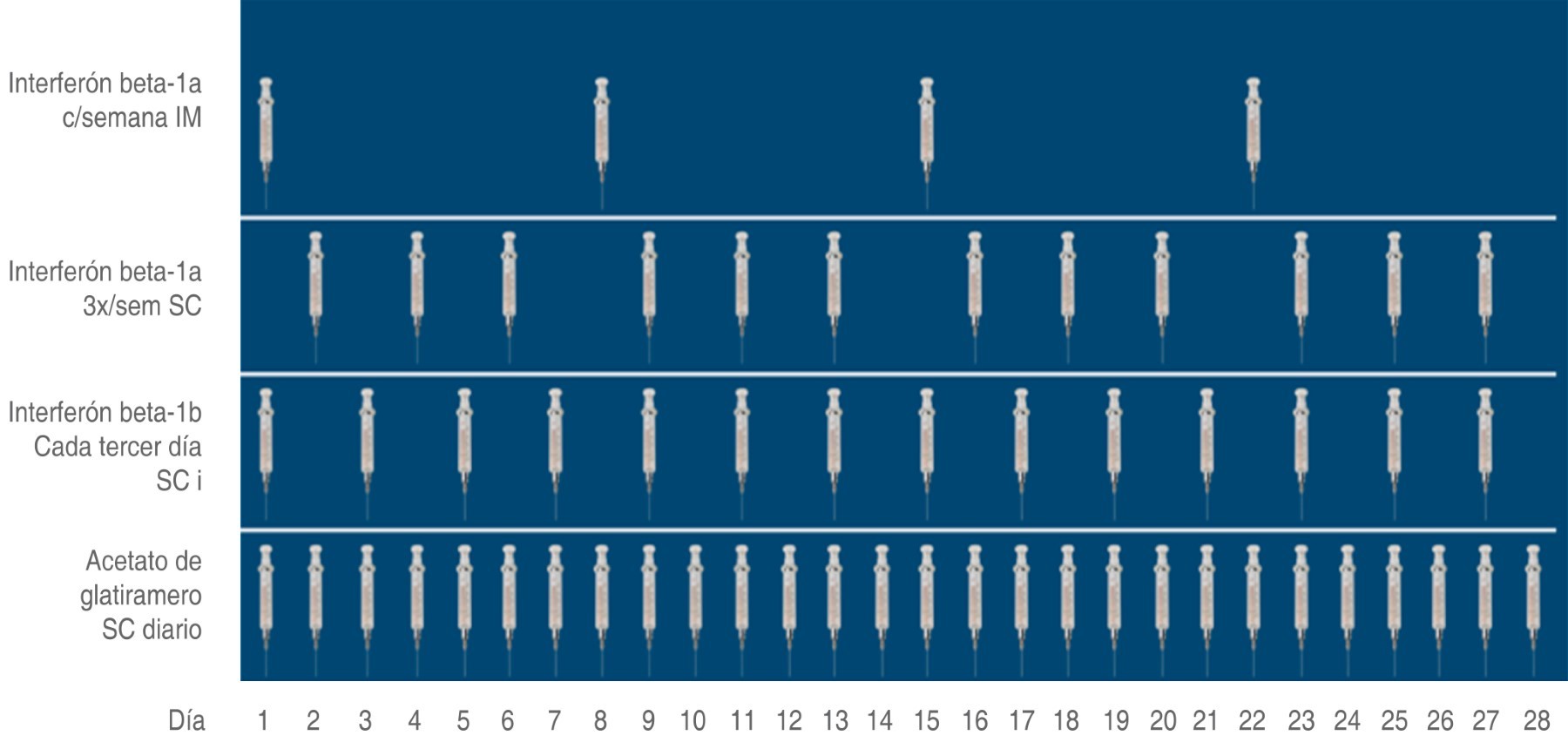 Los inyectables eran los medicamentos únicos accesibles para el tratamiento de la esclerosis múltiple, con adherencia variable, pero sin duda de utilidad en su momento. Respecto a la frecuencia de aplicación presentamos la Figura 1.