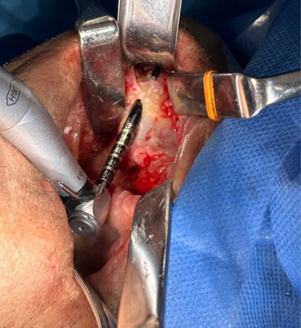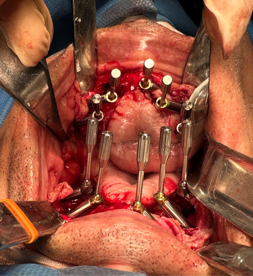 El objetivo de la reconstrucción fue restaurar su perfil y función. Para los pacientes con un defecto palatino completo sin apoyo del proceso alveolar, la retención de la prótesis puede ser un desafío debido a la falta de dientes, socavaduras mucosas adecuadas y la presencia de mucosa vestibular y nasal móvil no queratinizada. El procedimiento quirúrgico fue realizado bajo anestesia general, donde posterior a la realización de incisión circunvestibular bilateral y despegamiento de colgajo de espesor total se procedió a la colocación de cuatro implantes cigomáticos bilaterales, y un implante en piso de órbita (JD Zygoma. Dental Implant) (Figura 3). Se colocaron implantes cigomáticos de Ø4.3 mm bilateralmente, dos implantes de 45 mm de largo en el lado izquierdo y un implante de 47.5 mm y uno de 37.5 mm de largo en el lado derecho. Se colocó un implante de Ø4.3 mm en la región de piso de órbita de lado derecho y ligeramente angulado. Para alinear los pilares emergentes de los implantes cigomáticos con otros implantes y formar un arco en el maxilar, las emergencias de los implantes se angularon a la posición requerida con adaptadores MultiUnit angulados de 45 y 60°. Los implantes se colocaron cuidadosamente para que los pilares se alinearan para lograr adecuado soporte y evitar cualquier carga compensada como resultado de un cantiléver (Figura 4).