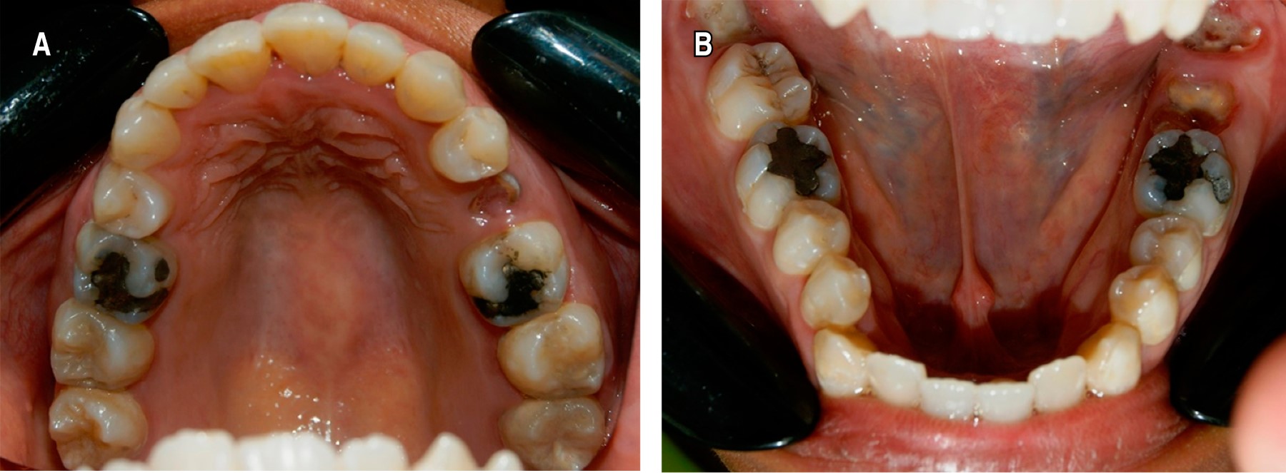 Se trata de paciente femenino de 19 años de edad, sin antecedentes médicos conocidos, quien acudió a nuestro servicio para valoración y tratamiento por presentar pérdida de sustancia calcificada a nivel coronal de OD 3.7 y 3.8. Al momento de la evaluación clínica del paciente se observó la presencia de los OD 1.8 y 2.8 y resto radicular de OD 2.5, 3.7, 3.8 y 4.8 (Figura 1A y B).