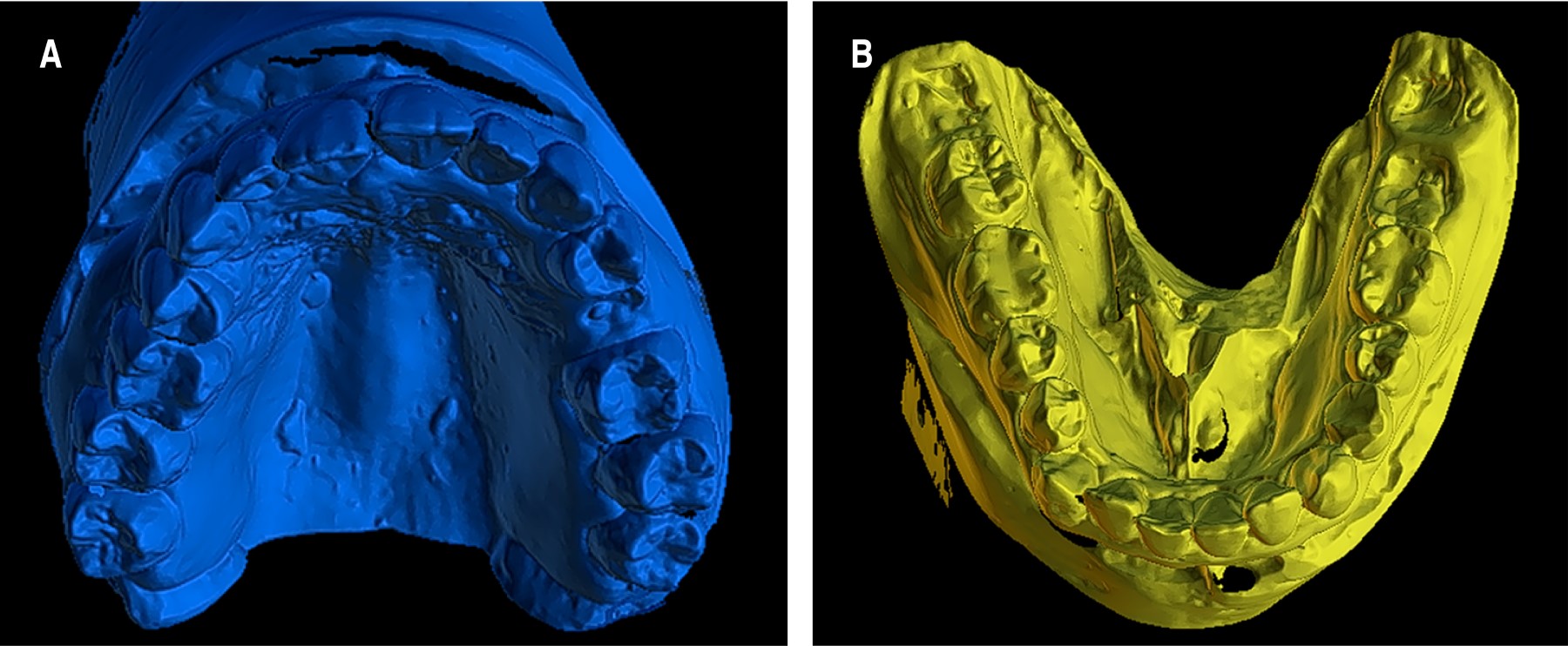 Se realizaron impresiones maxilares y mandibulares con alginato (tropicalgin, Zhermack), a los cuales posterior al vaciado con yeso rosado tipo IV (Pribanic) se les realizó escaneo con un escáner de mesa 3D (Medit MD-ID0300) para importar los modelos STL de los modelos al proyecto de planificación digital en el programa Blue Sky, plan desarrollado por Blue Sky Bio (Figura 2A y B).