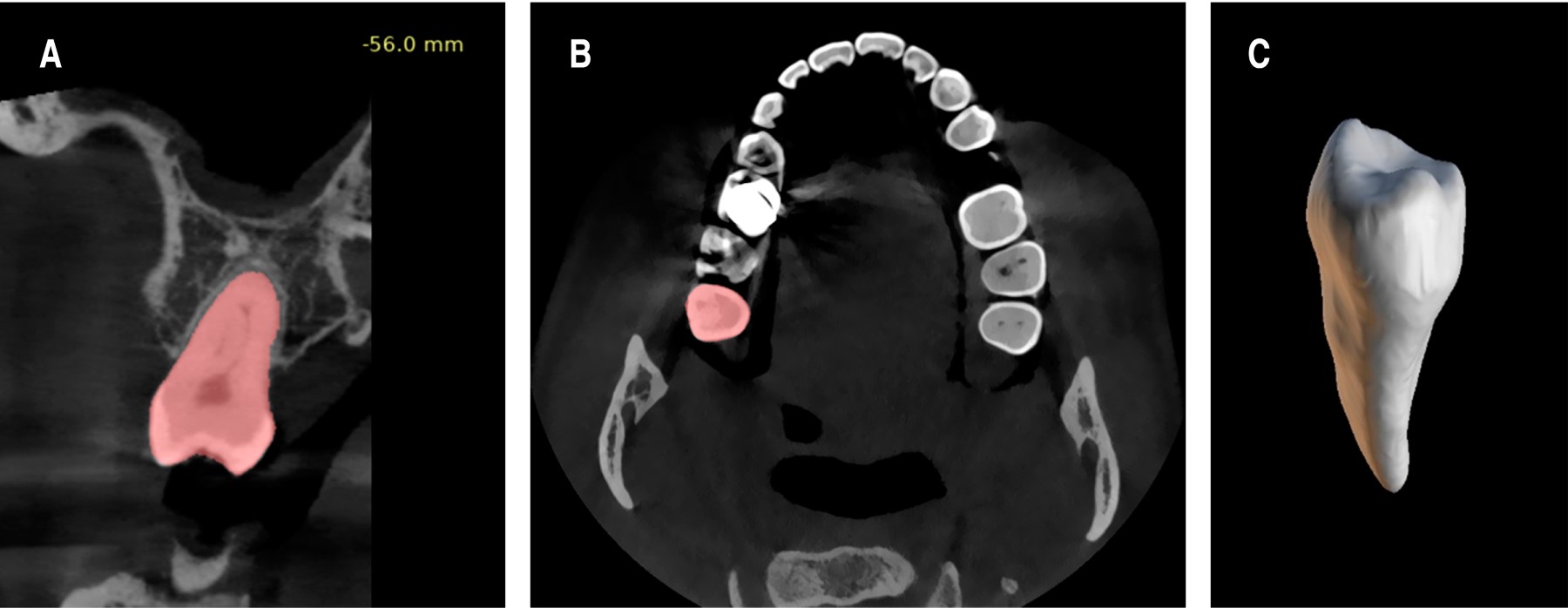 En el software de planificación digital se realizó mediante el panel de segmentación, la segmentación axial, coronal y sagital del diente donador para la creación de la reconstrucción volumétrica del diente (Figura 3A-C).