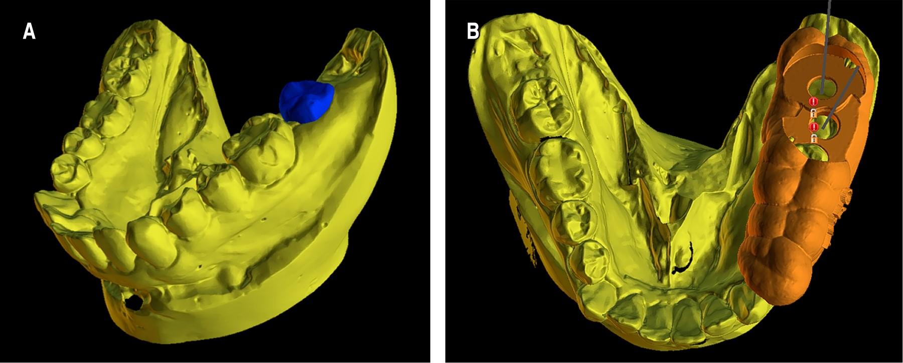 La reconstrucción volumétrica del diente donador se superpuso en el lecho receptor del modelo STL mandibular y se ubicó en la posición deseada, en infraoclusión con respecto al plano oclusal mandibular (Figura 4A). Posterior a esto, en el panel de la creación de la guía quirúrgica, se realizó la colocación de implantes digitales personalizados con una medida de oclusal de 4.5 mm y una medida apical de 4 mm con una longitud de 13 mm, para la creación de la guía de fresado del lecho receptor (Figura 4B).