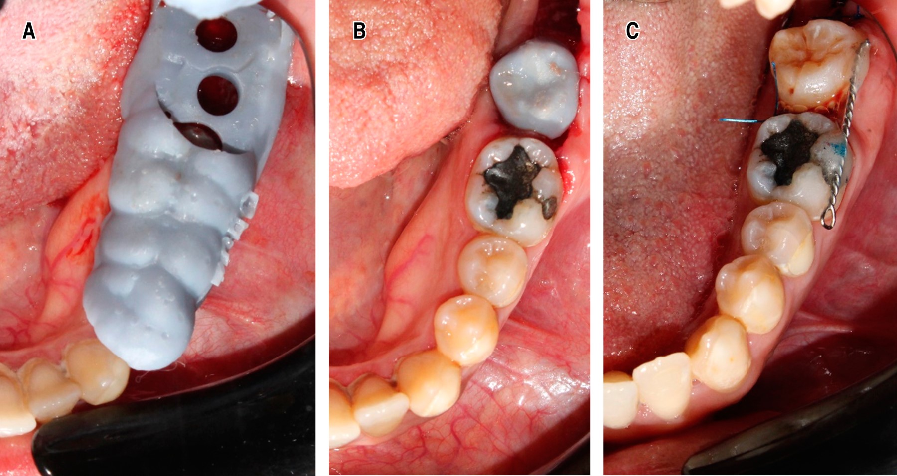 Se realiza colocación de férula quirúrgica multifresado en cuadrante III para fresado y acondicionamiento del alvéolo postextracción con fresas para implantes con tope de 4.5 × 13 (Mediment-Stainless) (Figura 5A).