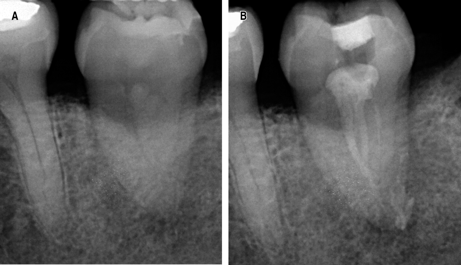 Posterior a la segunda semana del autotrasplante se realizó un primer control postoperatorio (Figura 6A). El paciente acudió con el especialista en endodoncia para realización del tratamiento de conducto con la colocación de hidróxido de calcio el cual se mantuvo en los conductos radiculares hasta el primer mes de postoperatorio, realizando así el control radiográfico (Figura 6B).