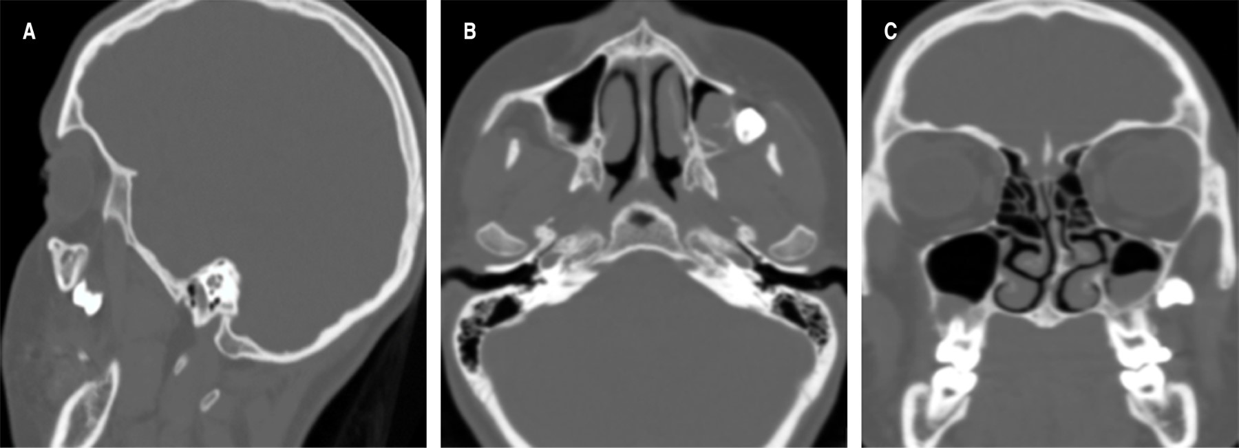 Tres semanas posteriores al procedimiento inicial, se realizó evaluación tomográfica en una TC de haz helicoidal, evaluando cortes axiales, coronales, sagitales y reconstrucción volumétrica se pudo observar imagen hiperdensa en relación con la fosa pterigomaxilar compatible con la UD 28 (Figura 3).