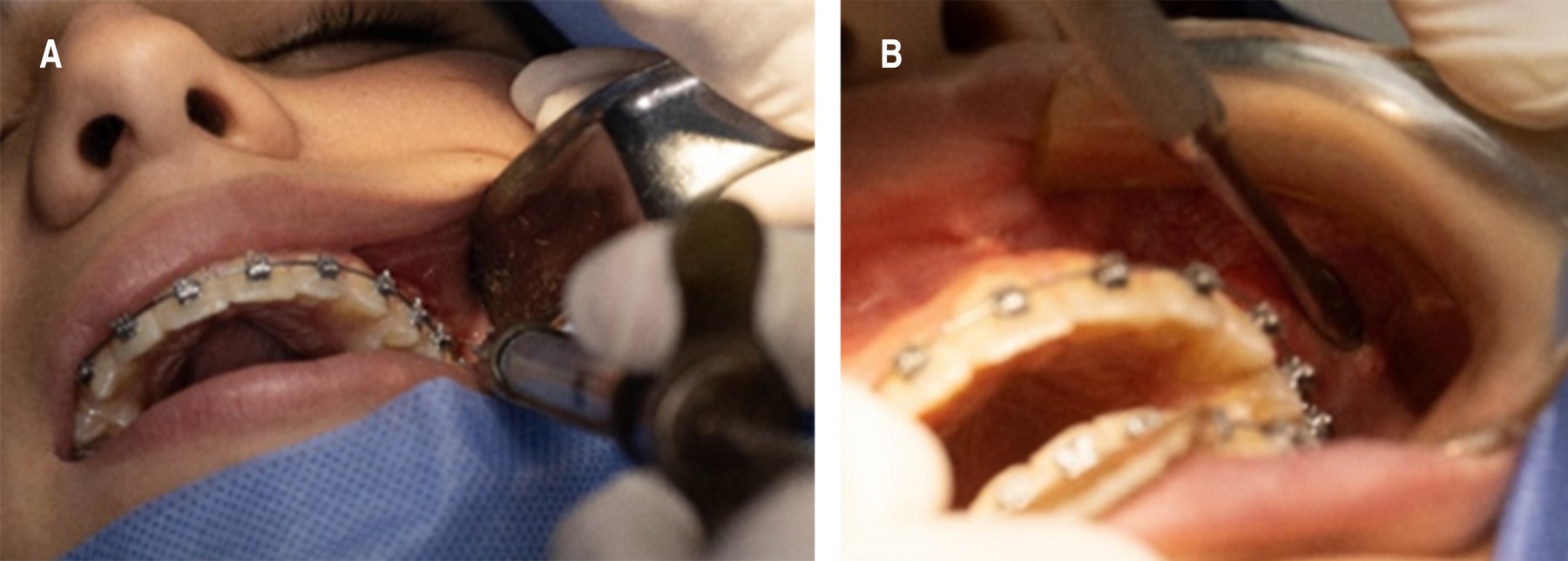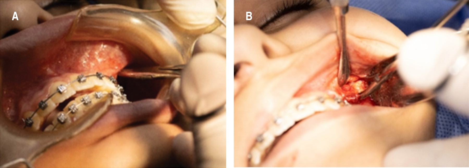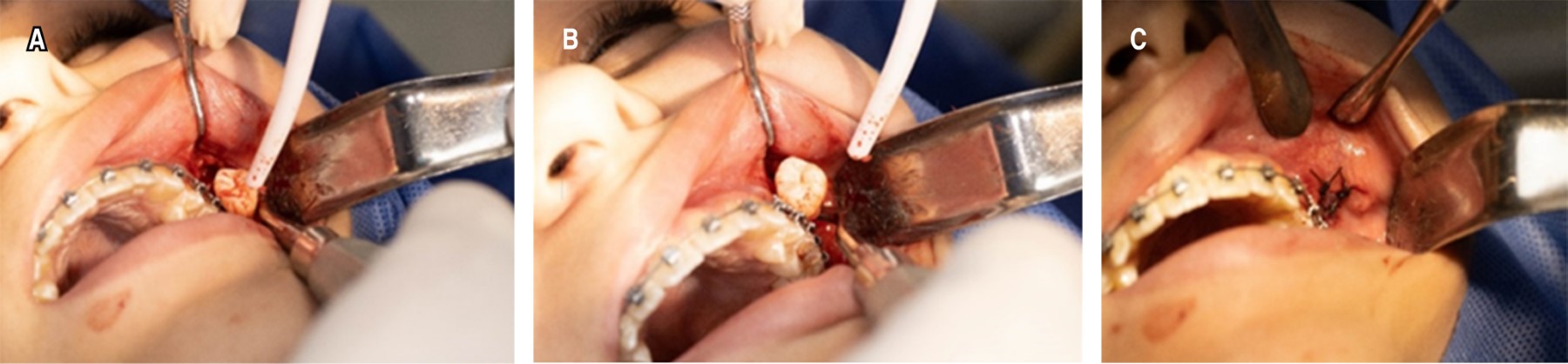 Se procede a realizar remoción quirúrgica del diente desplazado bajo anestesia local infiltrativa a base de lidocaína 2% con epinefrina 1:100,000. Se procede a realizar incisión en "T", usando el arbotante cigomático-maxilar como referencia (Figura 4). Se comienza disección roma con pinzas mosco curvas y se retrae tejido con separadores de Minnesota. Se localiza diente, teniendo precaución con las estructuras vasculares de la región. Una vez que se localiza, se realiza la avulsión del mismo con el uso de un elevador angulado y luego se sujeta firmemente con pinzas de Crile curva para su retiro (Figuras 5 y 6). Se lava herida con solución fisiológica y se procede a realizar reparación de la herida con catgut simple 3-0 y puntos discontinuos. Se dan indicaciones postquirúrgicas de cuidados e higiene. Se indica antibioticoterapia a base de amoxicilina/ácido clavulánico 875/125 mg por vía oral (VO) cada 12 horas, durante siete días y analgesia con ketoprofeno 100 mg VO cada ocho horas para el manejo del dolor.