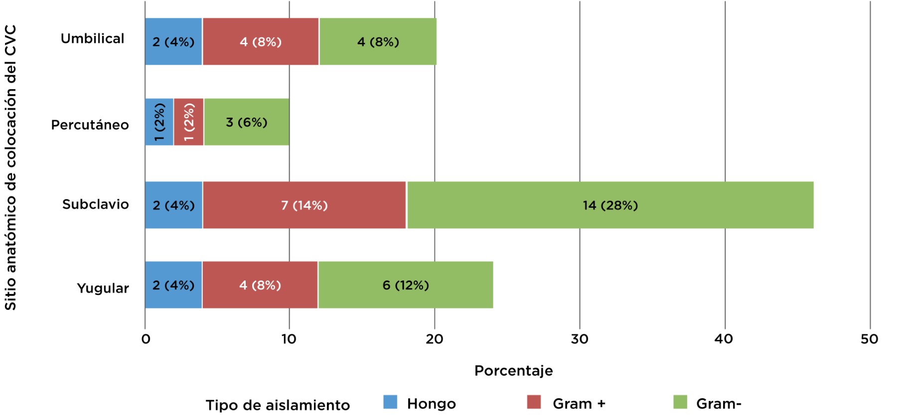 Los microorganismos que producen con más frecuencia las infecciones asociadas a CVC son aquellos cuyo hábitat natural es la piel. La etiología bacteriana de las infecciones neonatales cambia en las diferentes unidades y en diferentes momentos. Los microorganismos más frecuentes, según la literatura reportada, son los grampositivos (70% de los casos), y entre ellos destaca Staphylococcus coagulasa negativo (37,8%) y Enterococccus spp (11,2%). Los bacilos aerobios gramnegativos (Enterobacter spp, Pseudomonas aeruginosa, Klebsiella pneumoniae y Escherichia coli) representan 25%, y las levaduras (Candida spp) en torno a 5%.3