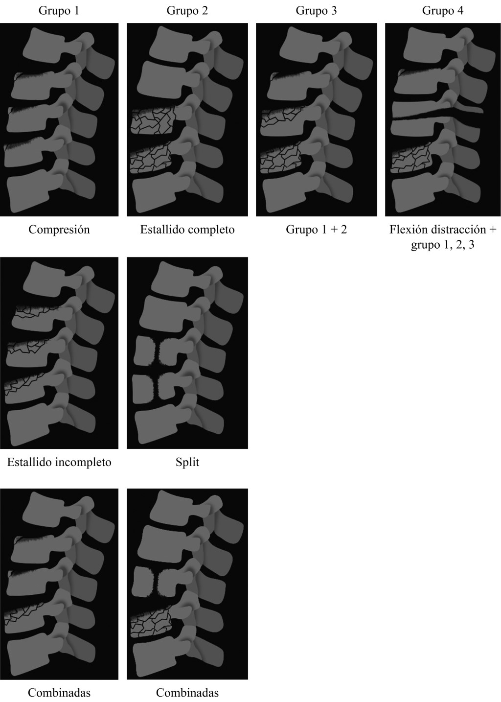 Grupo 1: lesiones que afectan una sola plataforma vertebral, correspondientes a fracturas por compresión y estallidos incompletos, en dos o más cuerpos vertebrales.