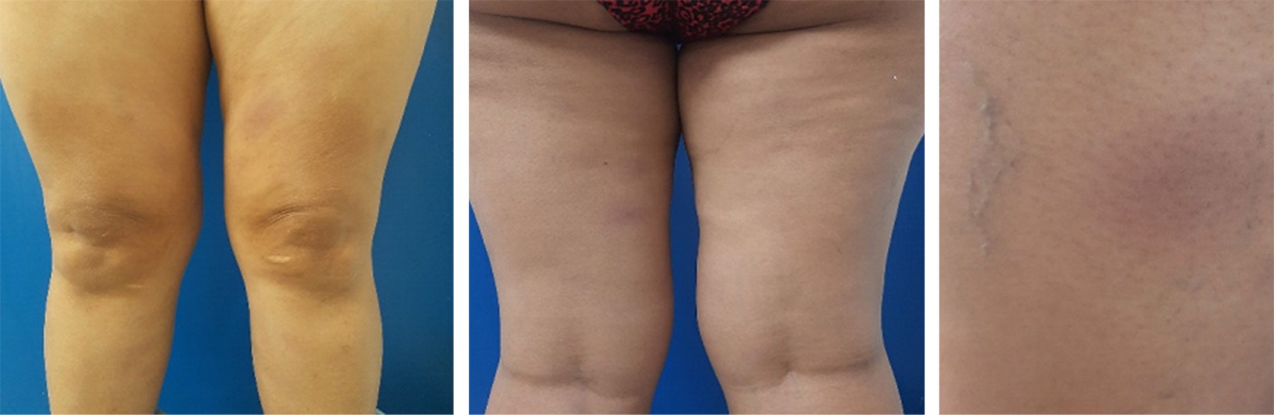En extremidades inferiores, placas eritematovioláceas circulares de 2 a 4.5 cm, consistencia firme y dolorosas a la palpación (Figura 3).