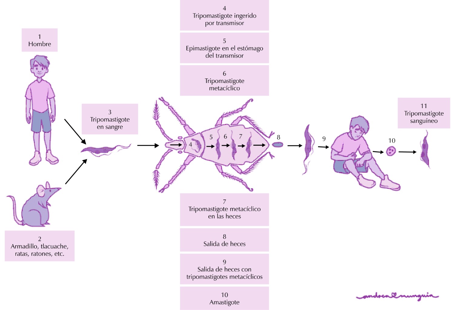 La infección se caracteriza por una fase aguda, que dura de ocho a 12 semanas, seguida de una fase crónica que, en ausencia de un tratamiento antitripanosómico, dura el resto de la vida de los pacientes, 30% de los cuales presentarán alteraciones cardiacas y 10% padecerán alteraciones digestivas, neurológicas o combinadas.