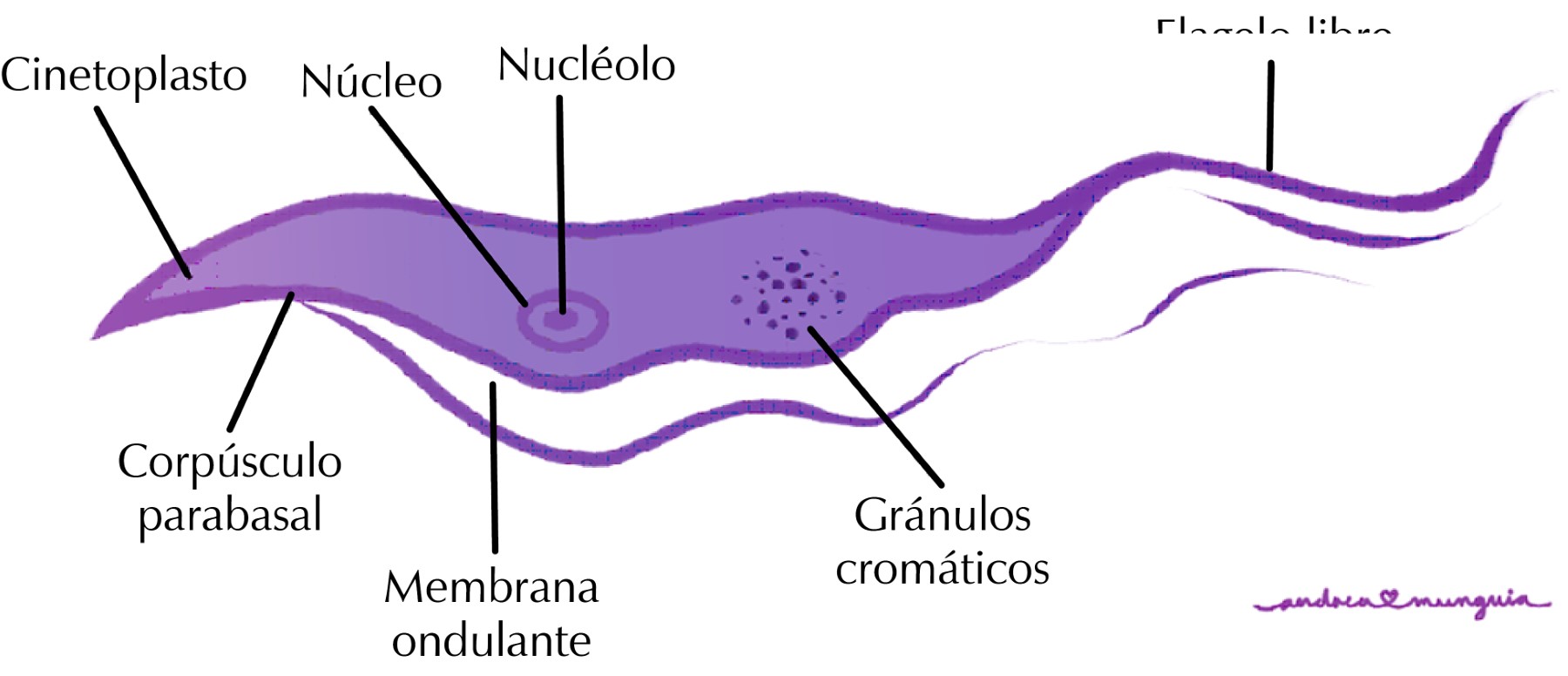 El tripomastigote metacíclico se encuentra en las heces del vector, tiene forma de "S" o "C" y mide de 18-21 μm; con tinción de Giemsa, se aprecia un núcleo en la parte media del cuerpo del parásito y, en la posterior, el cinetoplasto con el flagelo posterior al núcleo, presenta una membrana ondulante que recorre al parásito a lo largo junto con el flagelo; esta forma no es replicativa y es considerada infectante. El tripomastigote sanguíneo es morfológicamente similar al metacíclico; se encuentra en la sangre del vertebrado y puede ser infectante en los casos de transfusión de sangre o sus componentes.