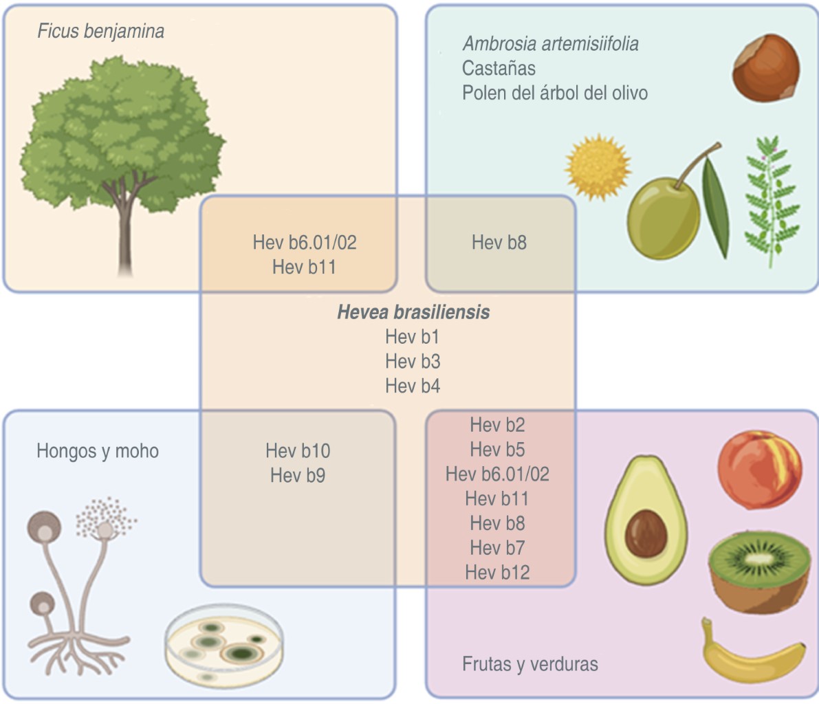 Es posible que aeroalérgenos de Ficus benjamina y Euphorbia pulcherrima muestran reactividad cruzada con el látex.2