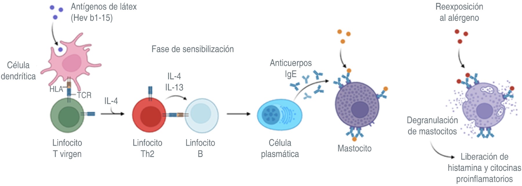 La alergia al látex es una reacción de hipersensibilidad inmediata, causada por la exposición previa a productos que contienen las proteínas de látex y se desencadena en las personas con IgE específica para este material, donde también intervienen algunas células.8