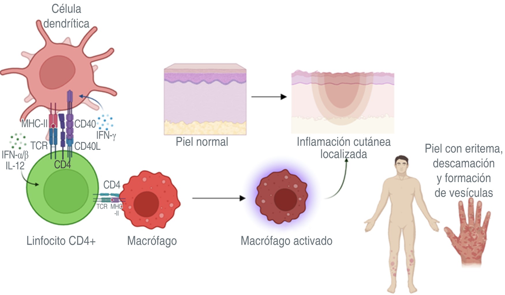 Reacción de hipersensibilidad tipo IV: producida por antioxidantes de látex como tiuram y carbamatos. Es mediada por inmunidad celular y produce hasta 80% de las reacciones al látex; las manifestaciones cutáneas se inician de seis a 48 horas postexposición en forma de eritema, vesículas y descamación. Clínicamente se manifiesta como eccema crónico con episodios de ataques agudos recurrentes de prurito, a veces vesicular. También se observa dermatitis de contacto debida a los aditivos utilizados en el procesamiento del caucho de látex (p. ej., 1,3-difenilguanidina) (Figura 4).5