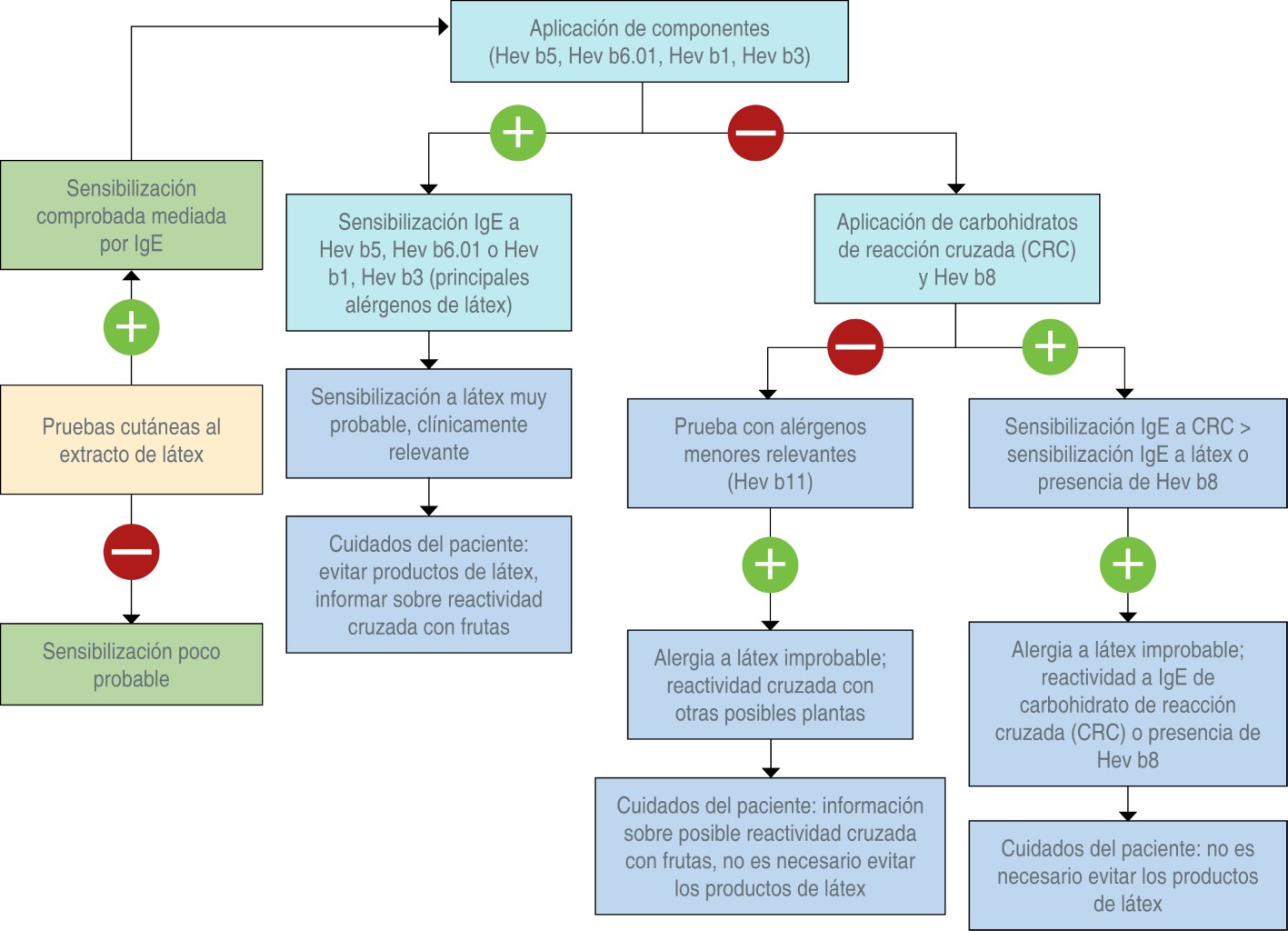 Las pruebas cutáneas tienen una sensibilidad de 95-99%. La especificidad va de 96-100% y deben hacerse con una concentración de 0.001 a 1 mg/mL de proteína. Los extractos de látex son inestables y con potencia variable (Figura 5).5,27