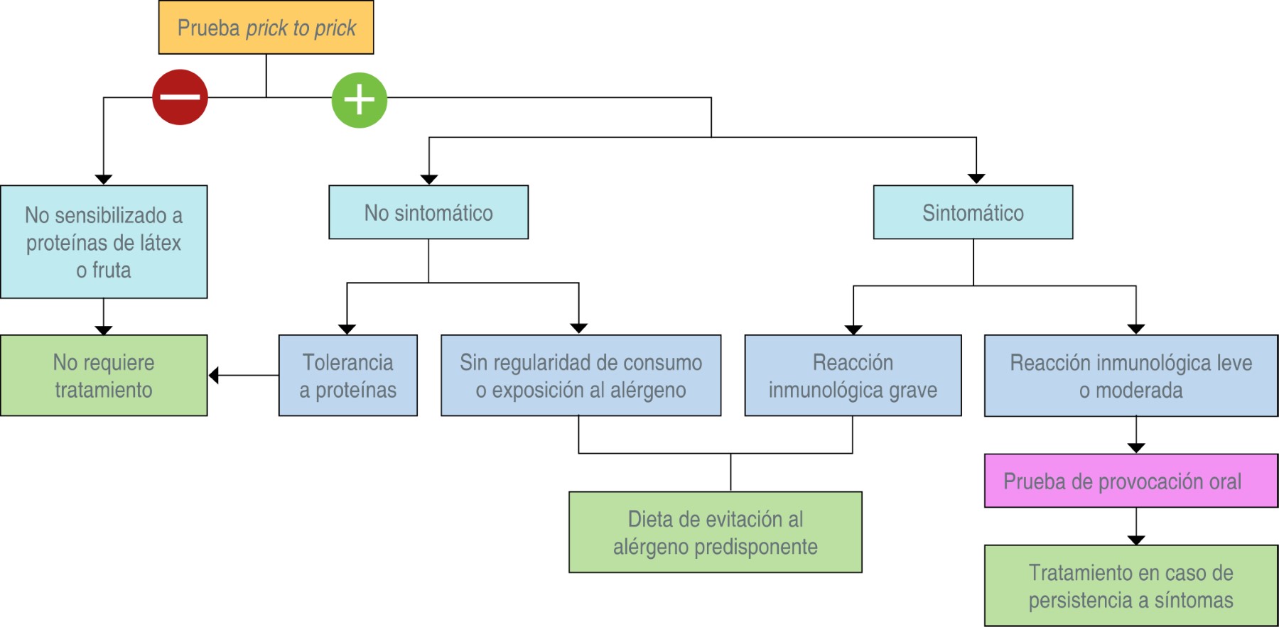 La prueba para determinar si existe sensibilización cruzada con alimentos es el prick test o prick to prick. También, si se ha logrado identificar el alérgeno, podría bastar sólo con la evitación (Figura 6).29