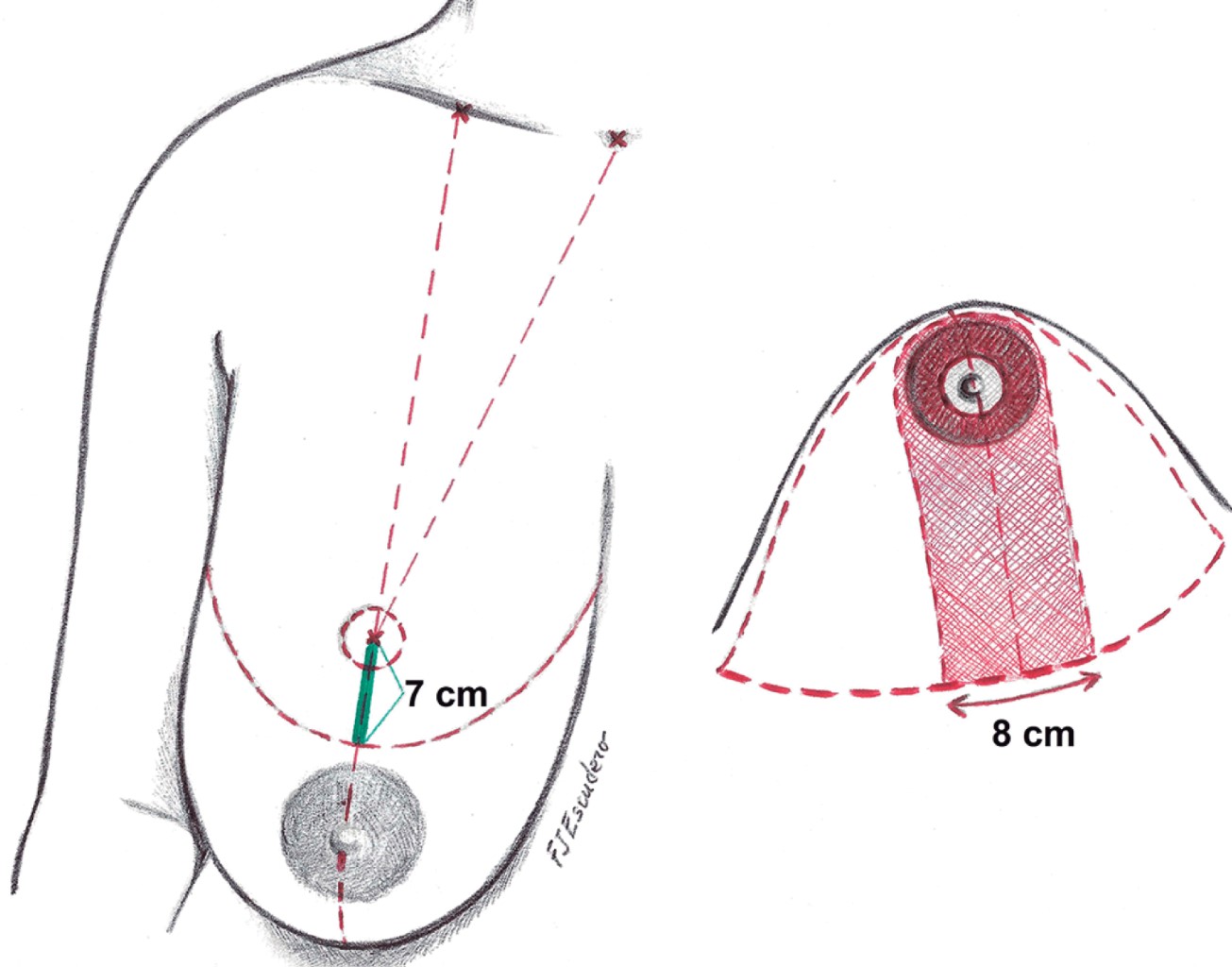 Según Yousif y colaboradores,8,9 la mamoplastia reductiva sin cicatriz vertical sólo es aplicable a mamas muy grandes y/o ptósicas, debiendo haber una distancia de al menos 7 cm entre la nueva posición del pezón y la areola original. Dicha medida será la suma del radio del nuevo CAP, habitualmente de 2 cm y de la distancia entre éste y el surco submamario, que suele ser de 5 cm. Se considera que debe disponerse de al menos 5 a 6 cm de piel sin pigmentación areolar, entre la nueva localización del borde areolar inferior y la areola original, para permitir colocar el pezón en una posición adecuada y, a su vez, proporcionar piel suficiente debajo del nuevo CAP para conformar el polo mamario inferior.1,8-14