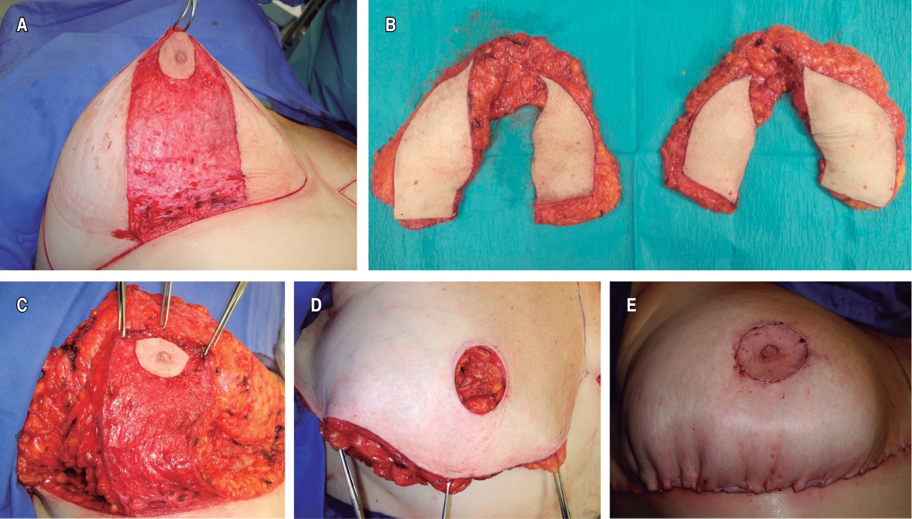La intervención se realiza con anestesia general y no se emplea solución vasoconstrictora. Se efectúan las incisiones cutáneas y el colgajo de pedículo inferior es desepidermizado, pudiendo incorporar el CAP reducido a 4 cm de diámetro (Figura 2A), o bien éste es extraído y preparado como injerto libre. El colgajo dermograso glandular es disecado con un espesor adecuado, de 4 a 5 cm en la base y 2 a 3 cm distalmente (Figura 2B). Por encima de la incisión superior curvada, correspondiente al nuevo surco submamario, se eleva un colgajo cutáneo con un espesor de alrededor de 2 cm, extendiendo su disección en mayor o menor grado dependiendo de la cantidad de reducción mamaria, pudiendo llegar hasta la fascia del músculo pectoral mayor. El exceso de tejido es extirpado de las regiones medial, superior y lateral (Figura 2C).
