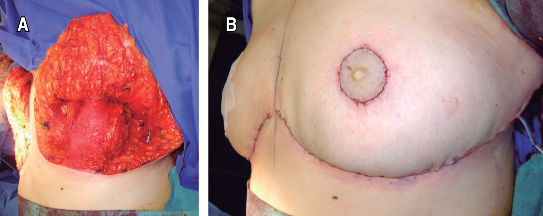 En la técnica se emplea un colgajo desepidermizado de pedículo inferior portador del CAP, o bien, asociado a un injerto libre de CAP. Se han descrito diversas variaciones en su diseño, con una base generalmente de 6 a 10 cm de anchura.1,8,9,15-17 En nuestra serie, al igual que en las de otros autores, la base tuvo una anchura de alrededor de 8 cm.8,9,16 La remodelación y fijación del colgajo mamario inferior mediante suturas, para lograr una forma mamaria satisfactoria, ha sido descrita por varios autores.11-13,17 En nuestra serie fijamos el colgajo a la fascia o músculo pectoral mayor en los casos de injerto libre de CAP. La finalidad de dicha fijación fue posicionar el colgajo adecuadamente para proporcionar una buena proyección y evitar su desplazamiento.