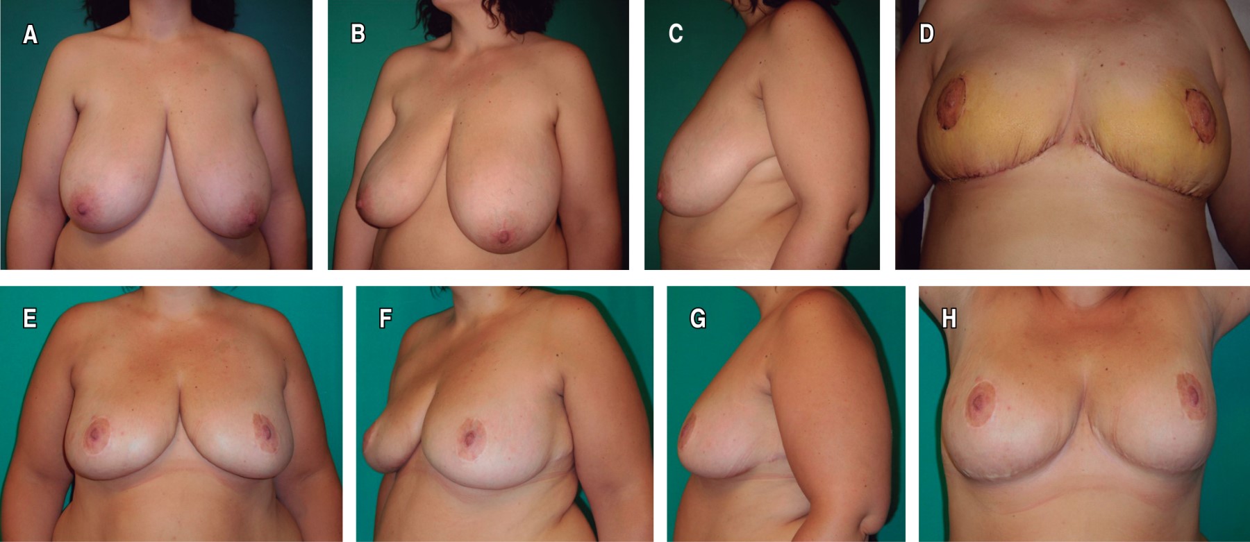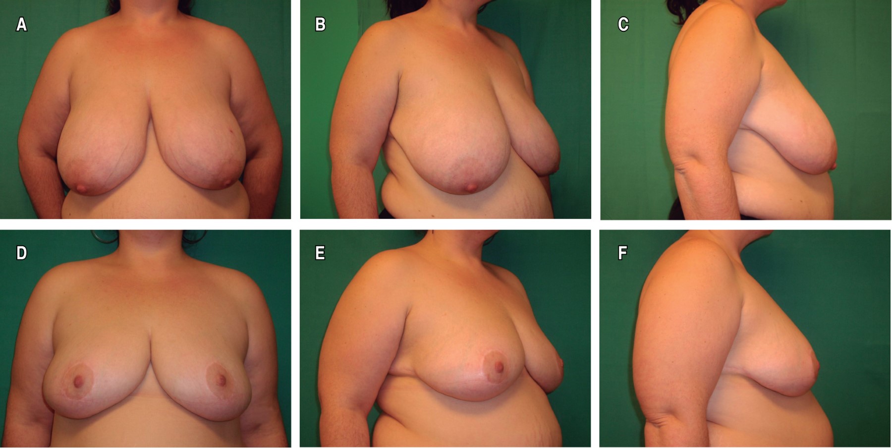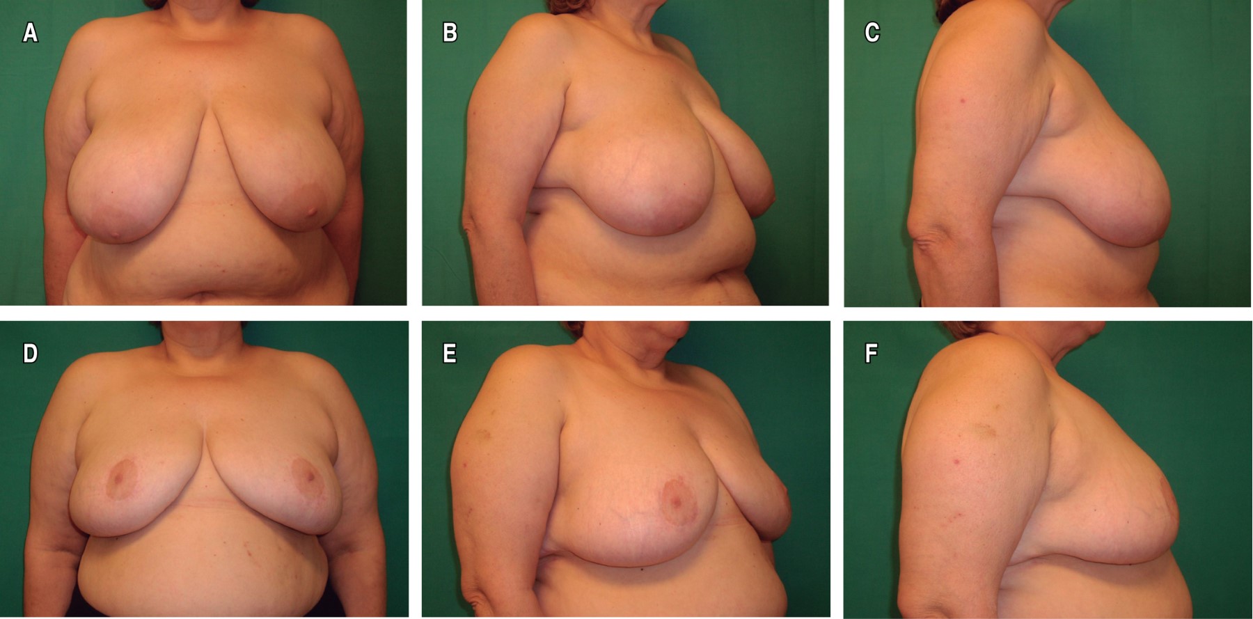 Los resultados estéticos se consideraron satisfactorios, lográndose también la resolución o mejoría de los síntomas y signos relacionados con el exceso de peso mamario. En general, las pacientes mostraron satisfacción con la reducción, forma y proyección mamaria obtenidas, así como con la apariencia y localización de las cicatrices. En seis pacientes (16%) con reducción bilateral persistió un exceso de llenado medial y lateral, en una mama (dos casos) o en las dos (cuatro casos), dando lugar a una forma algo ensanchada o cuadrada. No se realizaron correcciones por este motivo, al no preocupar a las pacientes. En las pacientes con colgajos de CAP no se apreciaron anomalías destacables en la sensibilidad de éstos, mientras que en las pacientes con injertos fue habitual una disminución o pérdida de sensibilidad. En las Figuras 4, 5, 6, 7, 8 y 9 se muestran casos representativos de la mamoplastia reductiva sin cicatriz vertical.
