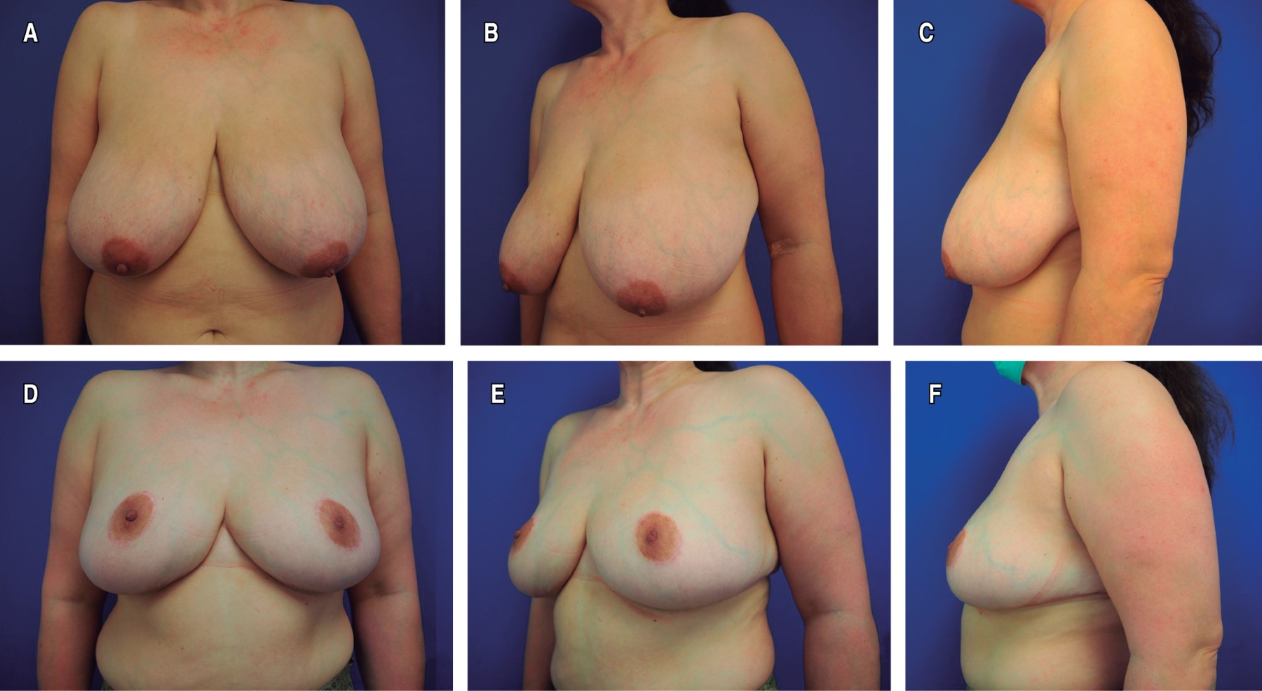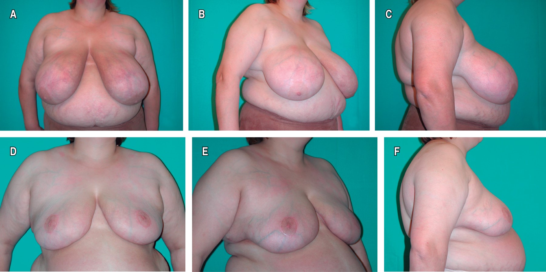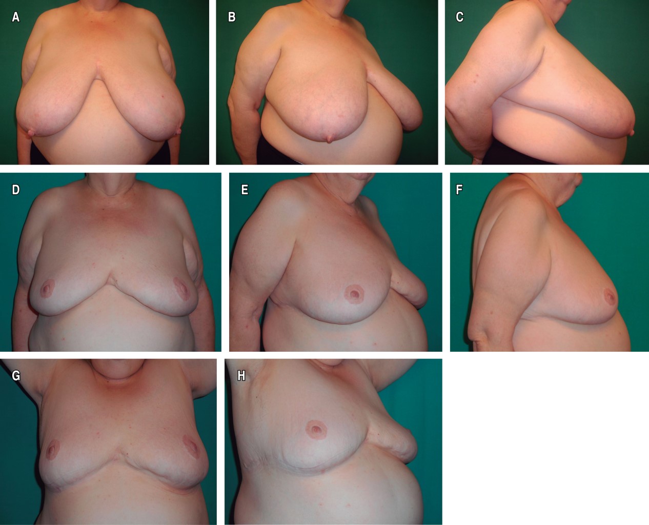 Los resultados estéticos se consideraron satisfactorios, lográndose también la resolución o mejoría de los síntomas y signos relacionados con el exceso de peso mamario. En general, las pacientes mostraron satisfacción con la reducción, forma y proyección mamaria obtenidas, así como con la apariencia y localización de las cicatrices. En seis pacientes (16%) con reducción bilateral persistió un exceso de llenado medial y lateral, en una mama (dos casos) o en las dos (cuatro casos), dando lugar a una forma algo ensanchada o cuadrada. No se realizaron correcciones por este motivo, al no preocupar a las pacientes. En las pacientes con colgajos de CAP no se apreciaron anomalías destacables en la sensibilidad de éstos, mientras que en las pacientes con injertos fue habitual una disminución o pérdida de sensibilidad. En las Figuras 4, 5, 6, 7, 8 y 9 se muestran casos representativos de la mamoplastia reductiva sin cicatriz vertical.