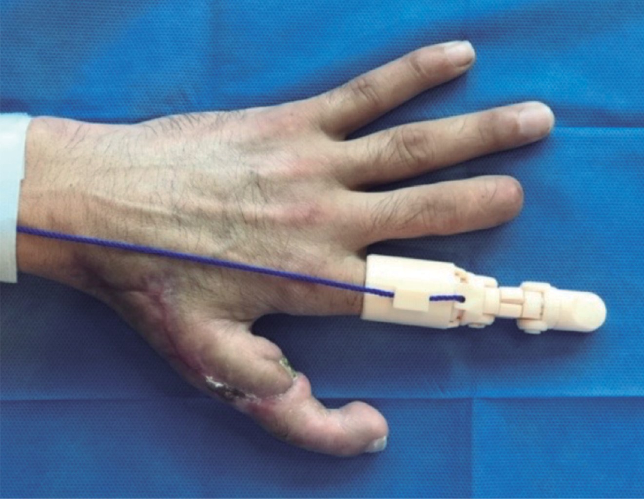 La colocación de la prótesis se logró mediante la utilización de cinta adhesiva que cubrió 1.2 cm de la punta digital para aumentar la comodidad del paciente. Además, se suturó hilo de nylon a una cubierta de plástico con una correa de velcro alrededor de la muñeca del paciente (Figura 3). De esta manera, la prótesis se activaba mediante la flexión voluntaria de la muñeca, lo que permitía la flexión de la articulación interfalángica.
