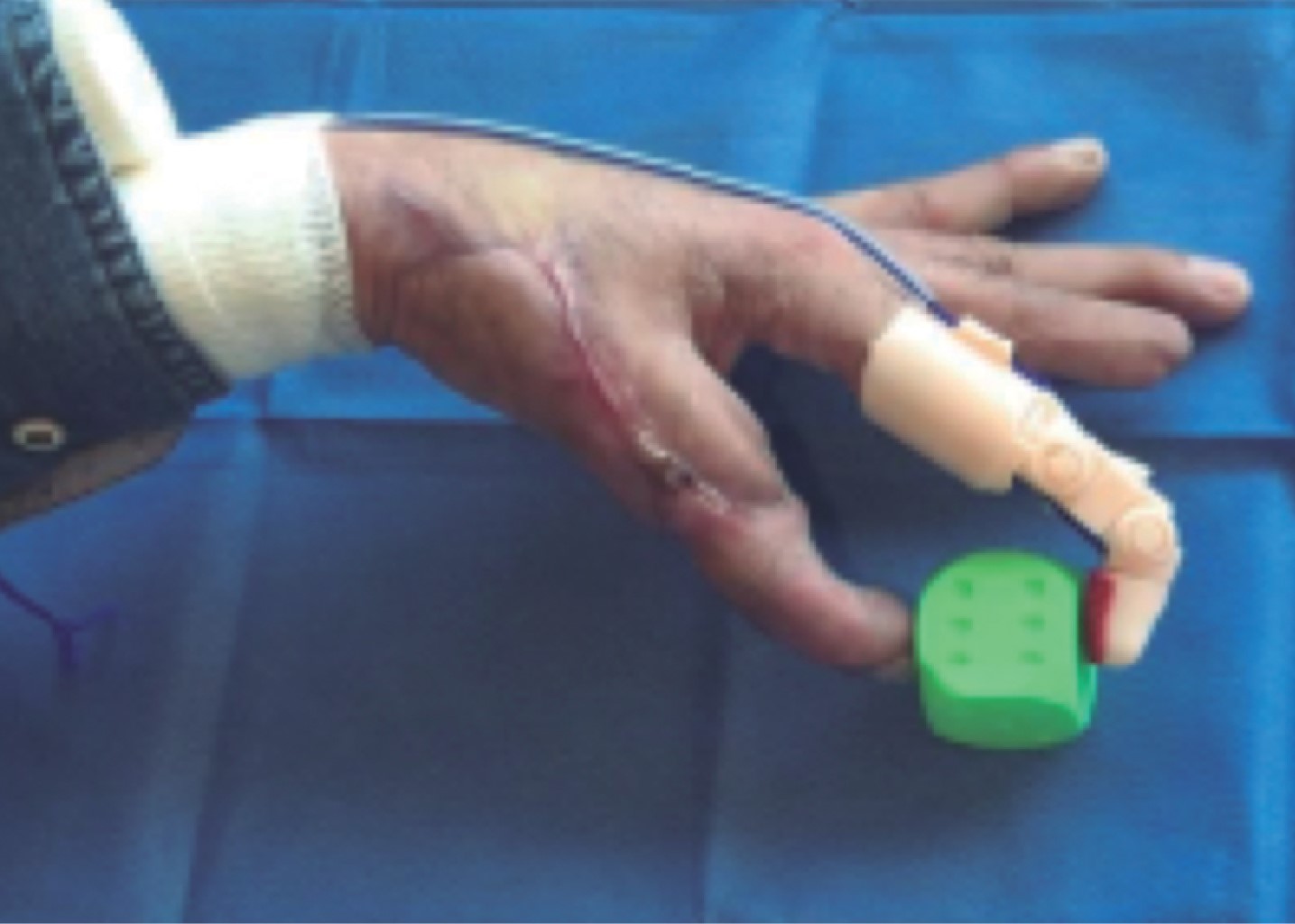 Hombre de 40 años que sufrió accidente pirotécnico que derivó en la amputación traumática del pulgar, índice y dedo medio de la mano izquierda. Manejado inicialmente con remodelación de los muñones y posteriormente se llevó a cabo la transferencia del primer dedo del pie al pulgar; sin embargo, el paciente rechazó someterse a una segunda transferencia para reconstruir el segundo y tercer dedo. Por lo tanto, se propuso la fabricación de una prótesis funcional para el dedo índice.