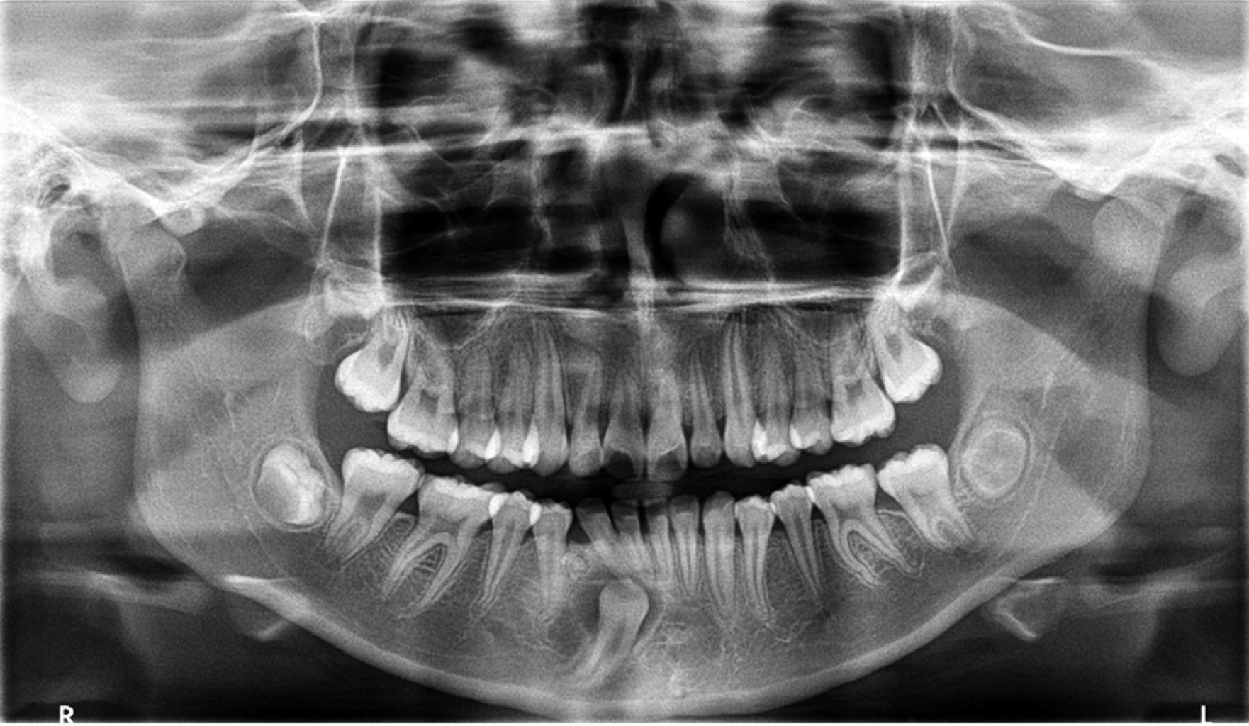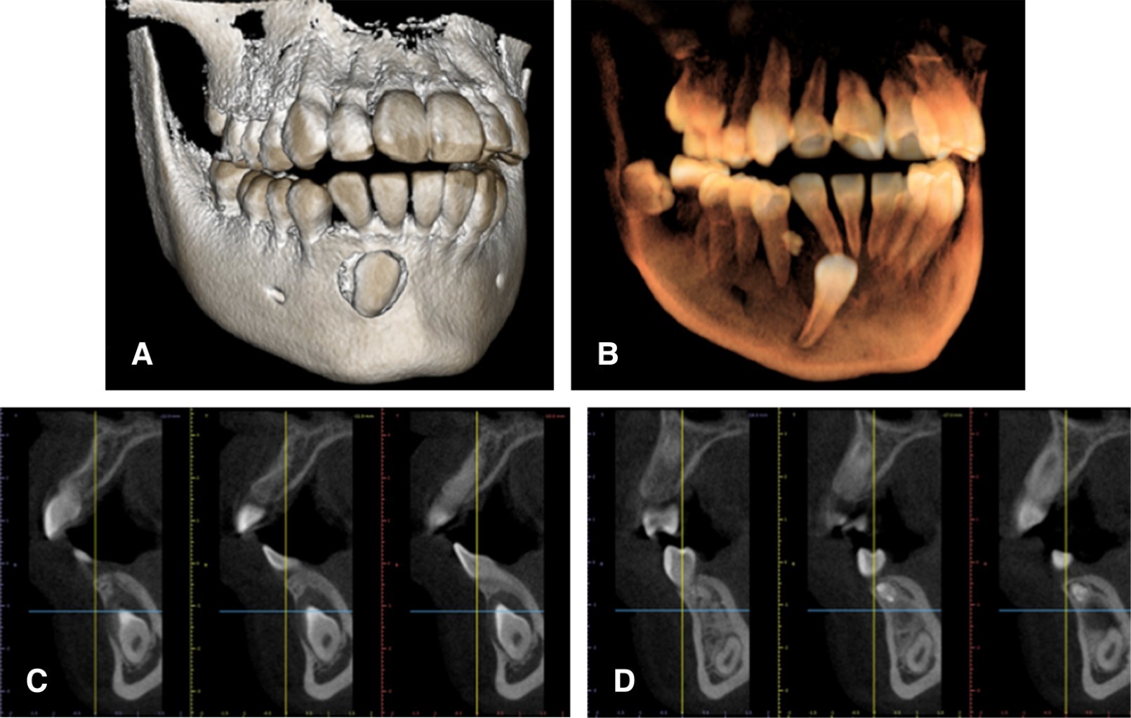 Paciente femenino de 12 años de edad sin antecedentes patológicos relevantes; fue referida al postgrado de periodoncia de la Universidad de Guadalajara, por observar radiográficamente un canino mandibular impactado, identificado por su ortodoncista tratante. En la evaluación clínica intraoral se identificó la ausencia del órgano dentario 43 y la presencia de un diastema entre los órganos dentarios 42 y 44; no se observó abultamiento o deformidad en la mucosa asociada a esa zona.