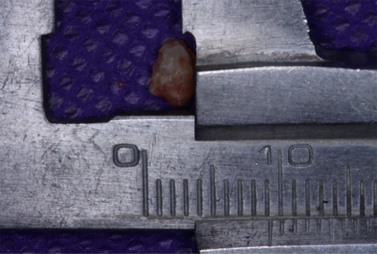 En el abordaje quirúrgico, se realizó un colgajo mucoperióstico para tener total acceso y visibilidad de la zona para remover las dos entidades. Para la enucleación de la lesión asociada al canino, se utilizó una cureta de Lucas, con la cual se removió la cápsula y el tejido circundante a la corona del canino retenido. El tejido removido fue tejido mucoso con forma irregular de diámetros variados (4 a 12 mm), de coloración grisácea blanquecina, de aspecto fibroso, que fue colocado en solución de formaldehído al 10% para someterse al análisis histopatológico. Posteriormente, una vez localizado el sitio anatómico donde se encontraba la segunda entidad en relación con la corona del canino retenido y a la raíz del órgano dentario 44, se procedió a realizar la osteotomía con una fresa quirúrgica bola #8 de baja velocidad e irrigando con solución fisiológica (Figura 3A-C). Se removió la entidad completa en una sola pieza (Figura 4). Después se realizó osteoplastia y se procedió a la cementación con resina de un aditamento para tracción (botón ortodóncico) en la porción coronaria expuesta del canino (Figura 3D). Para realizar la tracción del canino, se utilizó una cadena elástica que va del botón recién colocado hacía la aparatología de ortodoncia. Se le indicaron instrucciones postoperatorias, evitar el cepillado y uso de hilo dental en la zona donde se realizó la cirugía, llevar una dieta blanda, evitar actividad física y exposición al sol, todo esto para mantener su higiene oral y obtener una cicatrización sin complicaciones. Después de la cirugía, el enfoque terapéutico consistió en amoxicilina 500 mg una cápsula cada ocho horas, además de ibuprofeno 600 mg una tableta cada ocho horas durante cinco días al postoperatorio. El análisis histopatológico del tejido mucoso removido reveló un quiste dentígero (Figura 5).