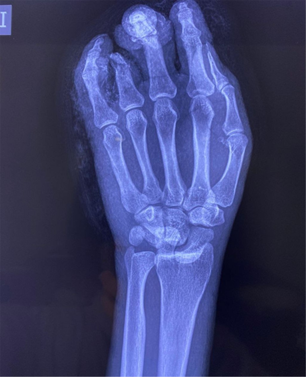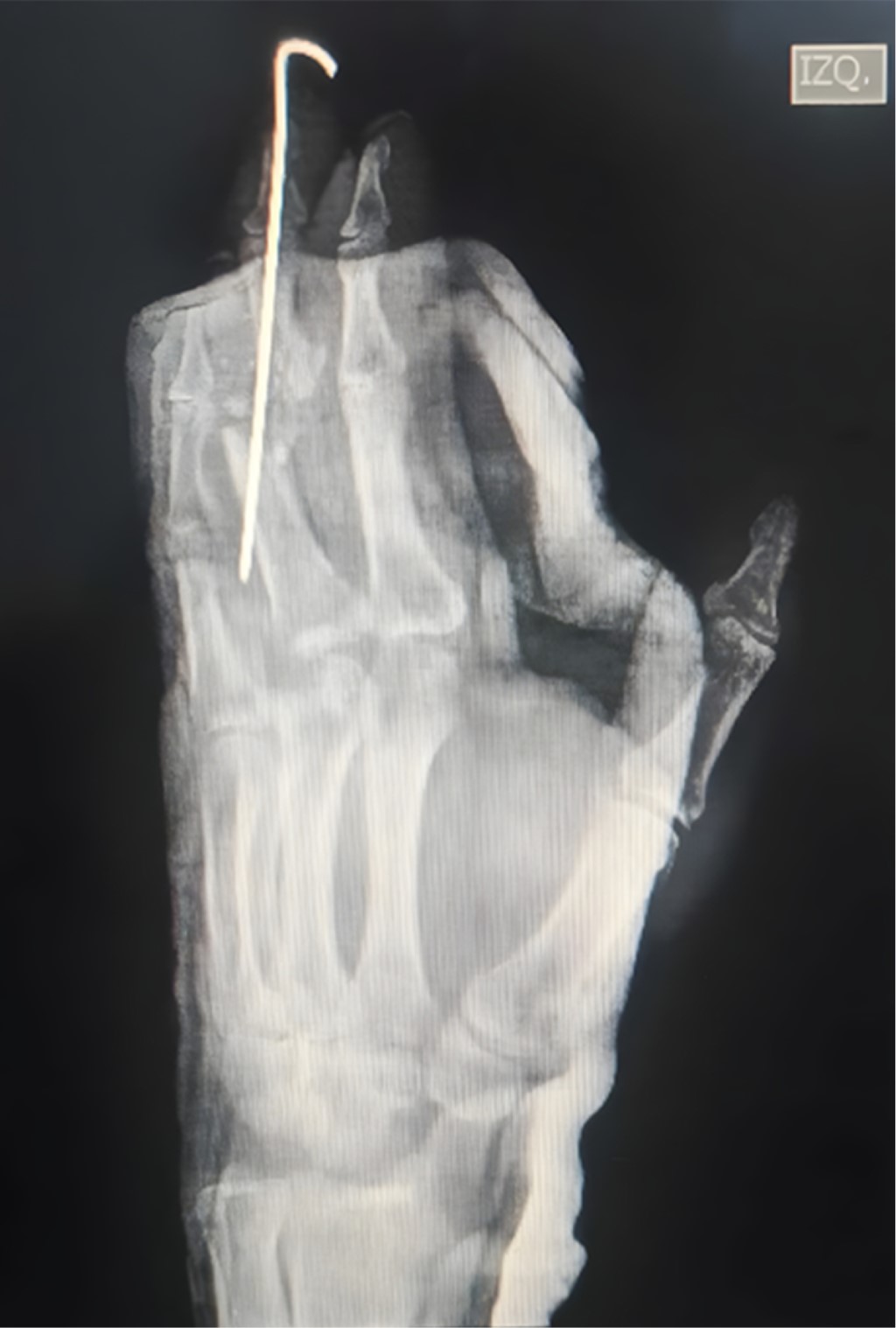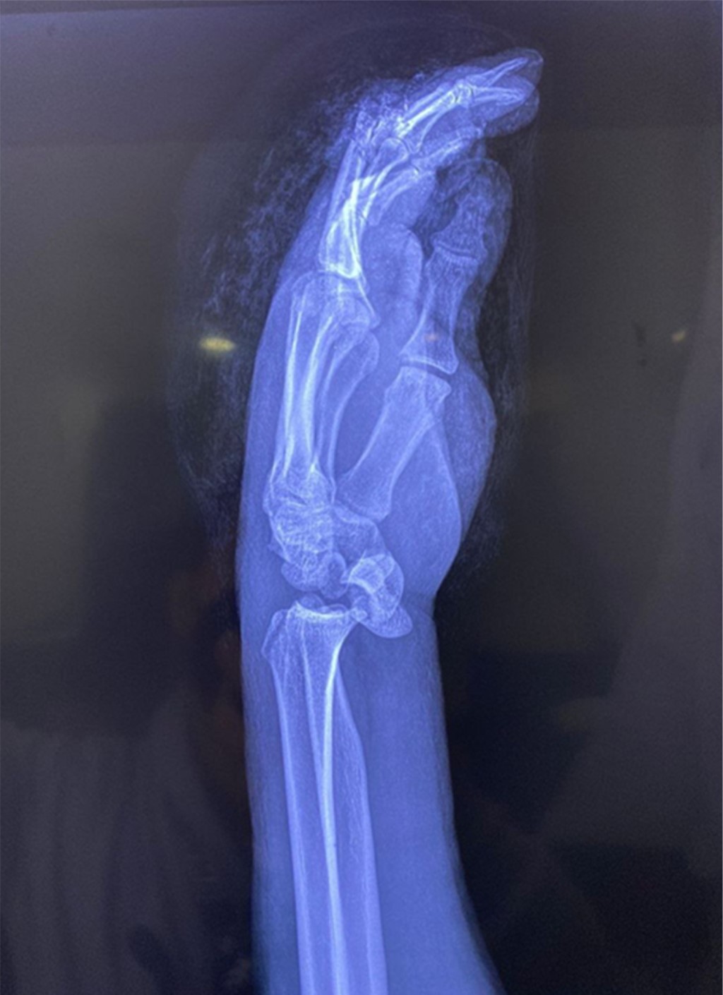 Además de presentar fractura en metáfisis proximal con extensión a metáfisis distal de F2 de tercer dedo, amputación traumática con desarticulación de F1-F2 más denudamiento de cuarto dedo, herida cruenta de quinto dedo más lesión del extensor propio del quinto dedo en zona V. A su ingreso pasa a cirugía de control de daños más reducción cerrada de luxación peri-escafo-transtrapecio-transtrapezoidea (Figura 3).