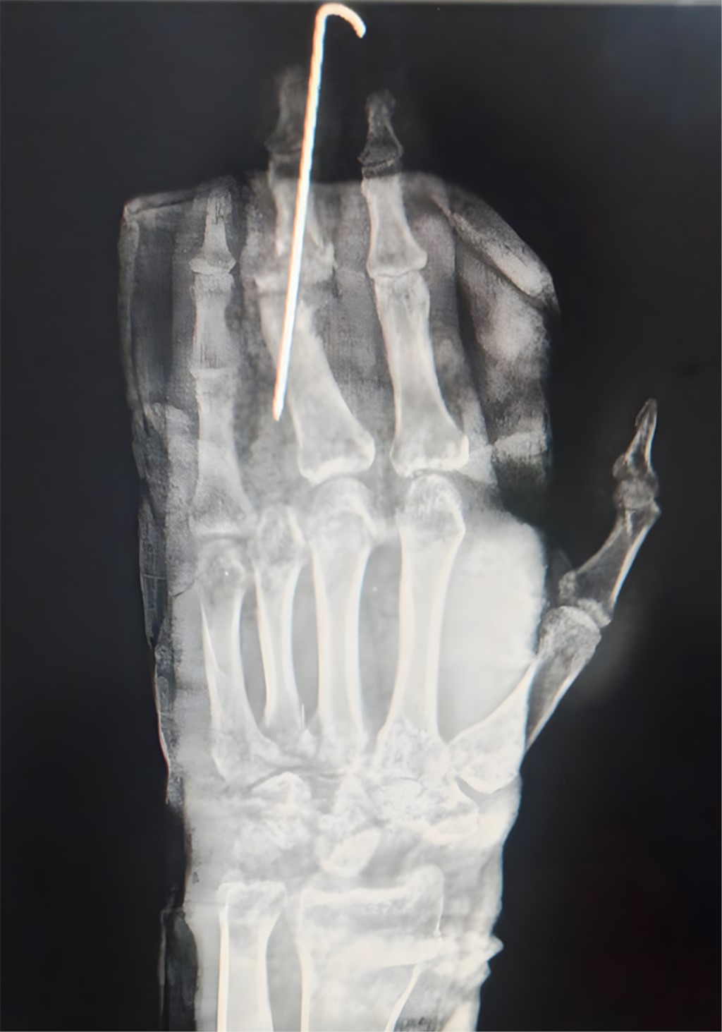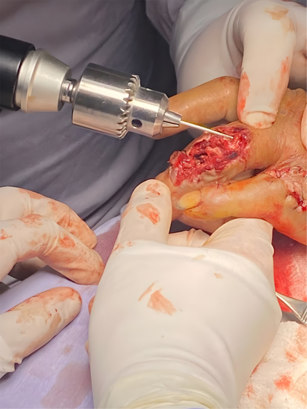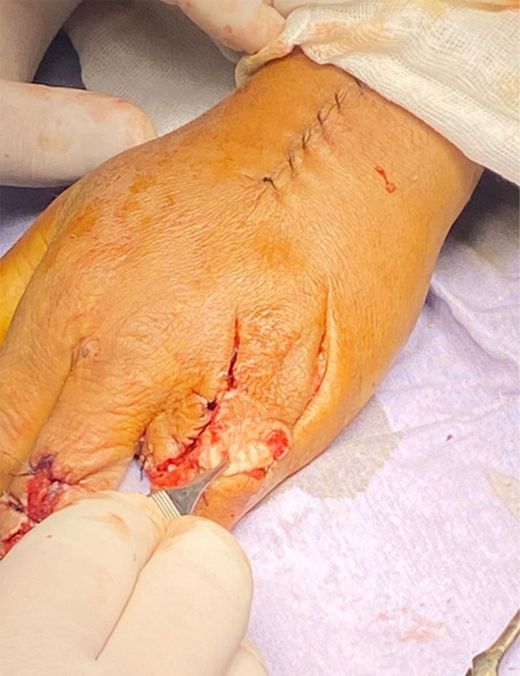 Durante su estancia se manejó con impregnación antibiótica más analgesia; posterior a la impregnación antibiótica, pasa a procedimiento definitivo donde se realizó carpectomía de muñeca izquierda (Figuras 4 y 5) con artrodesis de articulación interfalángica de F2-F3 tercer dedo (Figura 6) más tenorrafia de extensor propio de quinto dedo (Figura 7) y colgajo de herida cruenta en quinto dedo (Figura 8).
