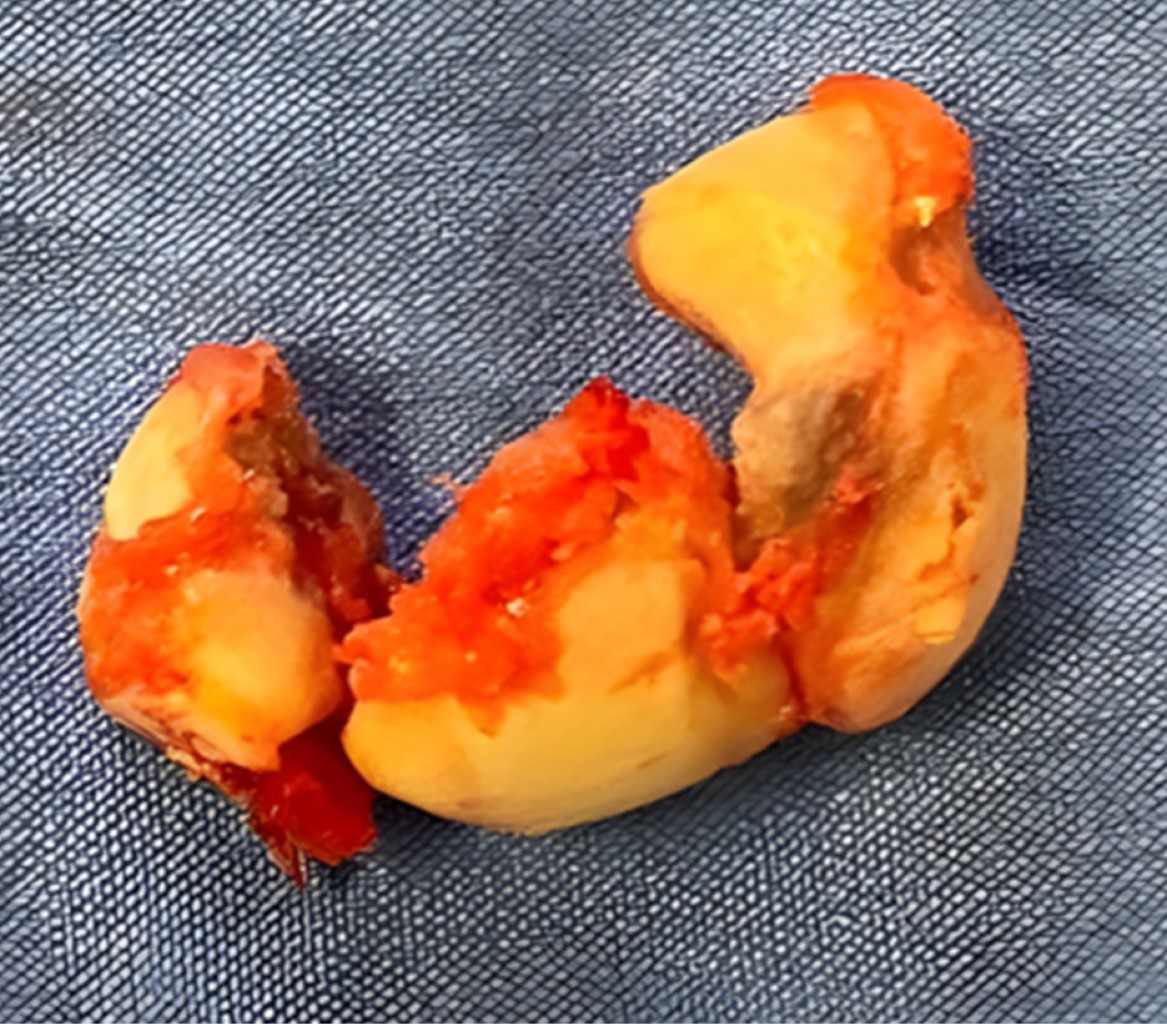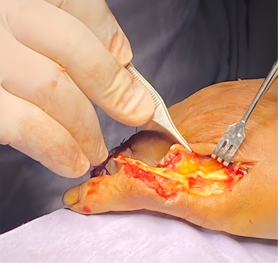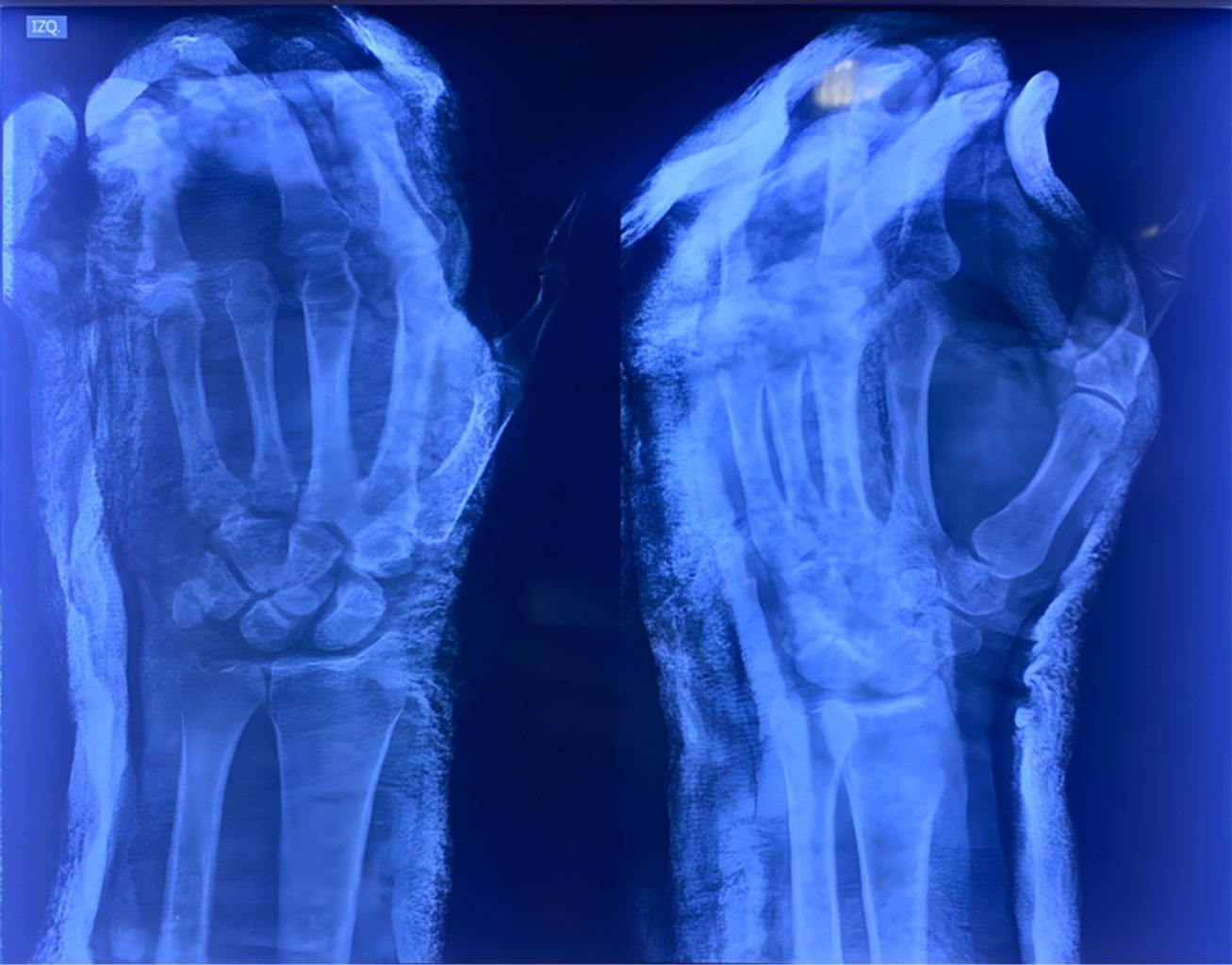 Durante su estancia se manejó con impregnación antibiótica más analgesia; posterior a la impregnación antibiótica, pasa a procedimiento definitivo donde se realizó carpectomía de muñeca izquierda (Figuras 4 y 5) con artrodesis de articulación interfalángica de F2-F3 tercer dedo (Figura 6) más tenorrafia de extensor propio de quinto dedo (Figura 7) y colgajo de herida cruenta en quinto dedo (Figura 8).