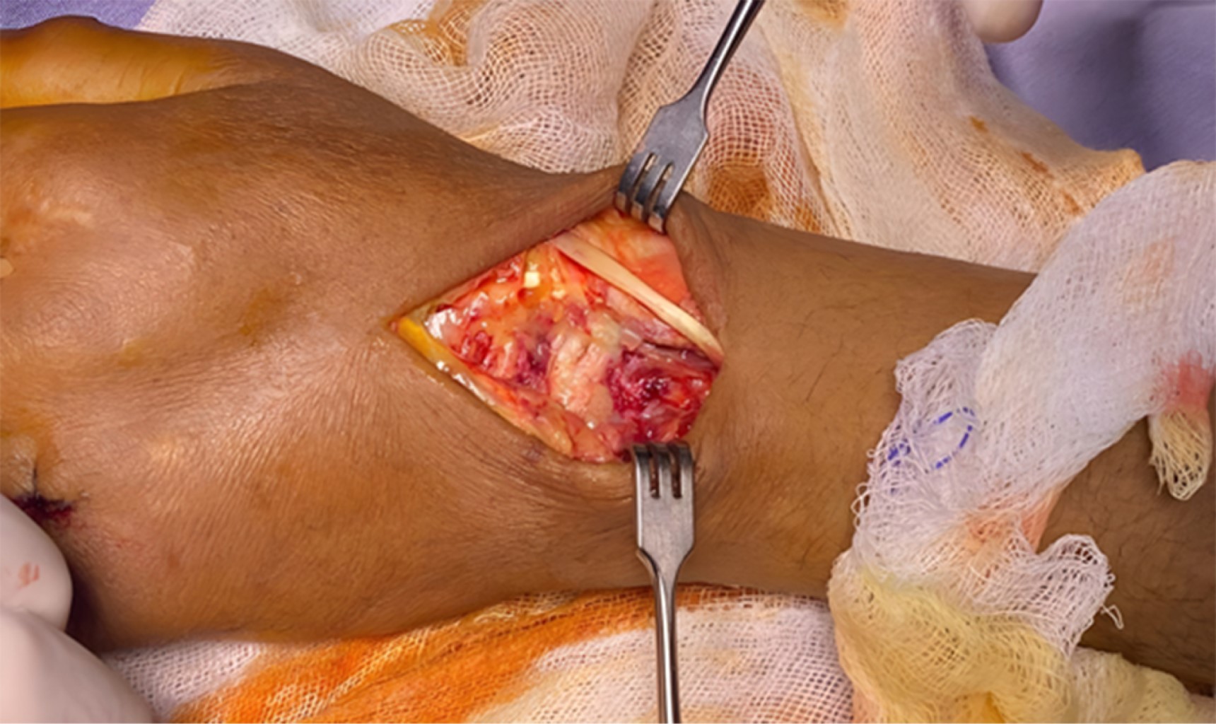 Técnica quirúrgica. Se realizó con vía de abordaje longitudinal posterior (dado a que presenta mejor exposición y disminuye el riesgo de presentar lesiones nerviosas), usando como referencia el tubérculo de Lister, se liberan los bordes cutáneos del retináculo extensor, liberando entre el tercer y cuarto compartimento extensor posterior, observando la cápsula articular, identificamos el interóseo posterior de lado interno al tubérculo de Lister, realizamos una capsulotomía en T con incisión transversal a 2 mm del borde radial de la inserción capsular y, paralela a él, la incisión vertical en el eje del tercer metacarpiano; exploramos la integridad de las fosetas del semilunar y del escafoides para poder realizar la resección de la primera fila (realizando tracción y flexión palmar), de este modo podemos realizar el retiro de los huesos de la primera fila del carpo (teniendo cuidado en no lesionar el cartílago del hueso grande); iniciamos con el retiro del semilunar, posterior del piramidal y finalizamos con el escafoides; después de eso se corrobora adecuada flexo-extensión de la muñeca; continuamos con el cierre de la capsulotomía en T, así como del ligamento anular, tejido celular subcutáneo y piel (Figuras 9 y 10).5