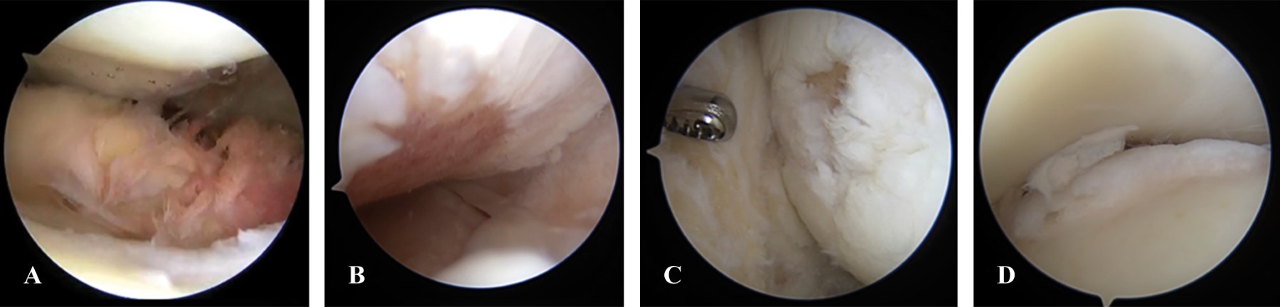 Durante la artroscopía, se realiza escotaduroplastía, liberación de LCP, desbridamiento de osteofito en espina tibial anterior, meniscectomía parcial de flap inferior del cuerno posterior y cuerpo de menisco lateral, meniscectomía parcial de raíz meniscal posterior remanente de menisco medial, extracción de cuerpos libres osteocondrales posteromediales, mediales y subcuadricipitales, remodelación de lesión condral en cóndilo femoral lateral en zona de carga, desbridamiento condral en periferia de cóndilo femoral medial (periartrosis), sinovectomía subcuadricipital (Figuras 4, 6, 7 y 8).