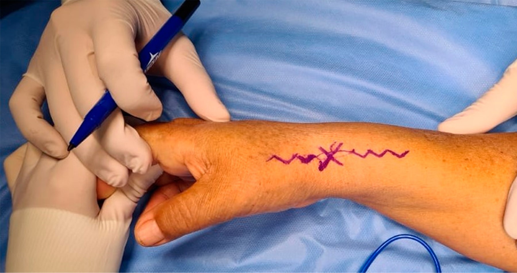 Es valorada en la consulta externa de cirugía de mano; durante el interrogatorio manifiesta síntomas dolorosos tipo eléctrico sobre cicatriz quirúrgica, evaluación con EVA 8-9 y disminución funcional severa por el dolor. A la exploración física, se encontró cicatriz intensamente dolorosa a la palpación, masa subcutánea concordante con zona dolorosa e hipoestesias de dorso de la mano distal a la cicatriz.