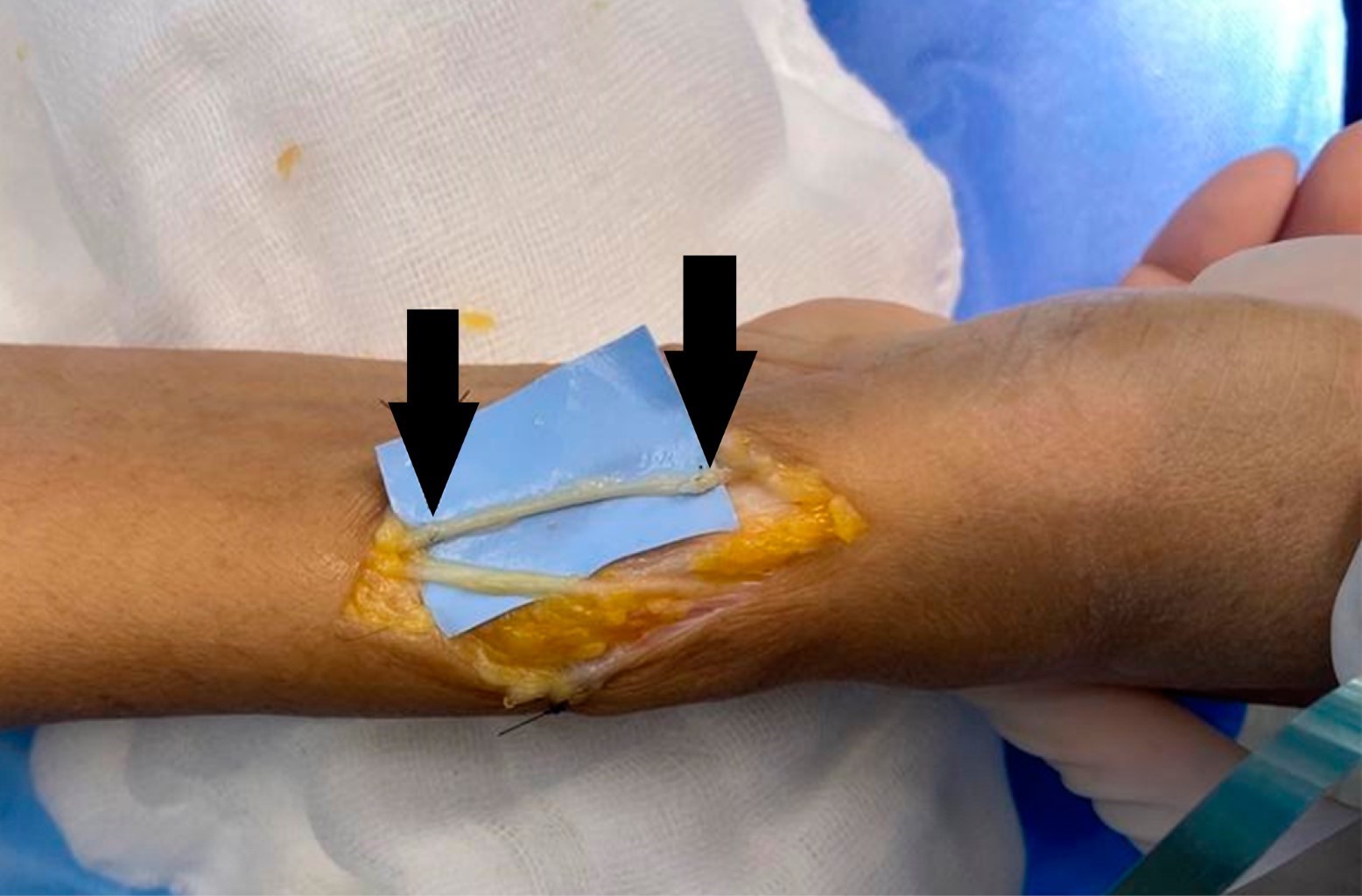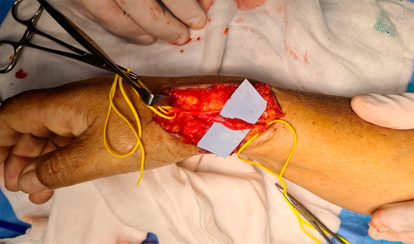 En sala de operaciones, previo a la inducción anestésica, se marcó el sitio con mayor dolor y se planificó abordaje amplio en zigzag (Figura 1). Posterior a la exploración, se encontró con un neuroma en continuidad de la rama lateral del nervio radial superficial (Figura 2). Se retiró el neuroma con bisturí hasta encontrar fascículos de apariencia sana. Se midió la brecha entre los cabos y se encontró brecha de aproximadamente 3 cm. Se decidió tomar injerto de nervio sural para reconstruir el nervio lesionado. Se realizó abordaje abierto para exposición de nervio sural mediante incisión de 15 cm en borde posterolateral de pierna derecha, tomando como referencia anatómica una línea imaginaria entre tendón calcáneo y maléolo lateral. Se expuso nervio sural, se tomó injerto de nervio sural de 4 cm y los muñones remanentes se enterraron en tejido muscular adyacente.