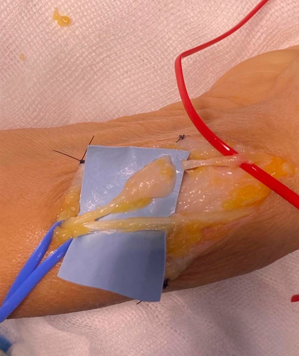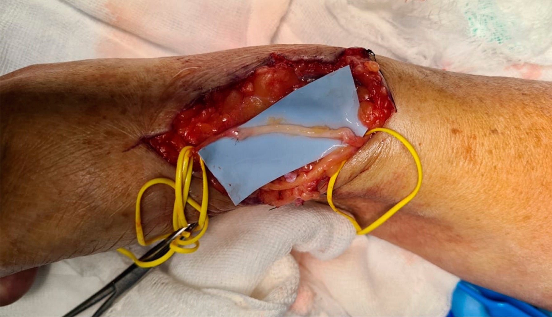 Durante la exploración en el quirófano se encontró sección completa del nervio radial superficial en su rama lateral. Proximal a la lesión, se detectó crecimiento neural compatible con neuroma terminal (Figura 4). Se retiró neuroma y muñón distal hasta observar nervio de apariencia sana mediante brote de fascículos y se realizó reconstrucción de nervio con autoinjerto de nervio sural (Figura 5). El autoinjerto de nervio sural fue cosechado mediante abordaje abierto de 15 cm en región posterolateral de pierna ipsilateral.