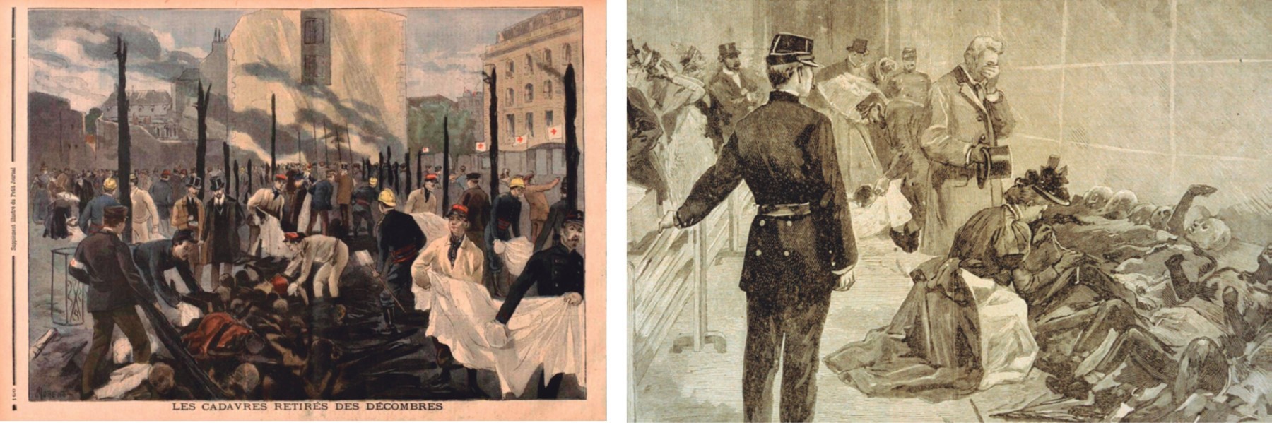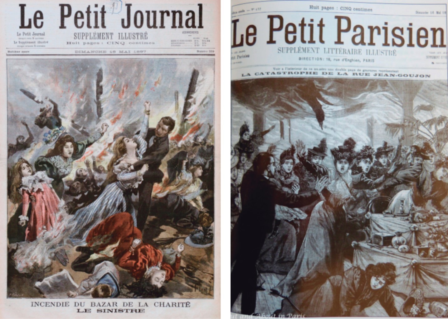 Durante la celebración del Bazar de la Caridad, se instaló en el sitio un novedoso cinematógrafo para la época, el cual fue colocado justo frente a la salida. Dicho cinematógrafo funcionaba con un sistema de oxígeno y éter en lugar de electricidad. El encargado de cambiar las películas cinematográficas era el proyeccionista, el Sr. Bagrachow, quien, al tener que cambiar la cinta en un sitio con notable oscuridad, encendió un fósforo que causó un incendio que consumió el lugar en minutos.2 El terrible evento tuvo lugar alrededor de las 16:15 horas del 4 de mayo de 1897. Lo anterior fue tan fatal debido a que el bazar estaba decorado con material igualmente inflamable, lo cual favoreció el esparcimiento del fuego. El foco del incendio se ubicaba sobre la única posible vía de salida, a través de la cual todas las víctimas intentaron salir sin lograrlo, dejando como consecuencia 126 cuerpos encimados unos sobre otros, al congestionarse las personas sobre la única vía de salida. Se sabe que la mayoría de las víctimas eran mujeres (Figura 1).
