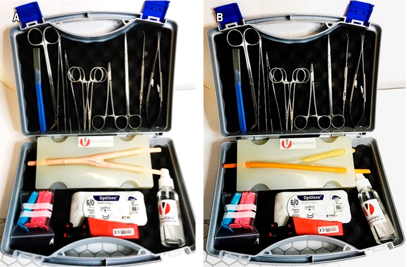Los participantes recibieron la caja con instrumental. El modelo de arteria para la endarterectomía carotídea consistió en un vaso bifurcado con placa en su interior (arteria carótida con placa, SimuVasc®, Albacete, España). El modelo de la arteria de derivación consistió en un tubo (arteria sintética, SimuVasc®, Albacete, España). La caja incluye un parche bovino para cerrar la endarterectomía carotídea (Xenosure® Biological Patch LeMaitre Vascular Inc®, Burlington, MA, EE. UU.) y un bypass protésico biológico (prótesis vascular biosintética Omniflow II, LeMaitre Vascular Inc®, Burlington, MA, EE. UU.). Como resultado del aprendizaje, tuvieron que grabar en video el desempeño del cierre del parche carotídeo o el bypass.
