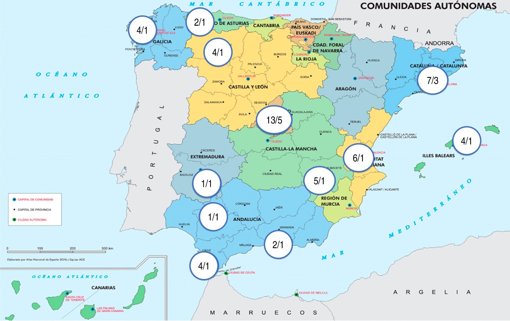Los seis talleres planificados se llevaron a cabo en seis lunes consecutivos del 22 de junio al 27 de julio. Invitamos a 63 alumnos de 18 hospitales españoles diferentes a unirse a los talleres (Figuras 2 y 3).