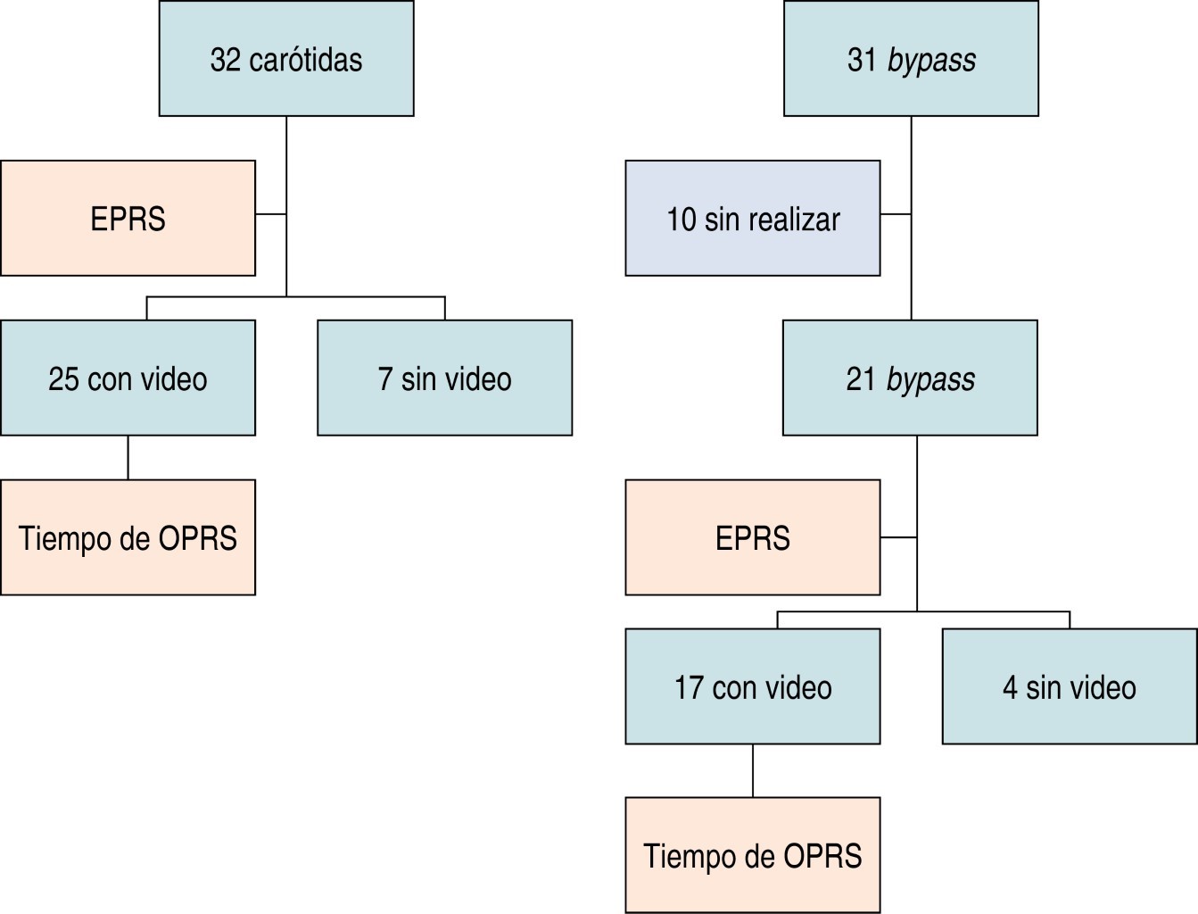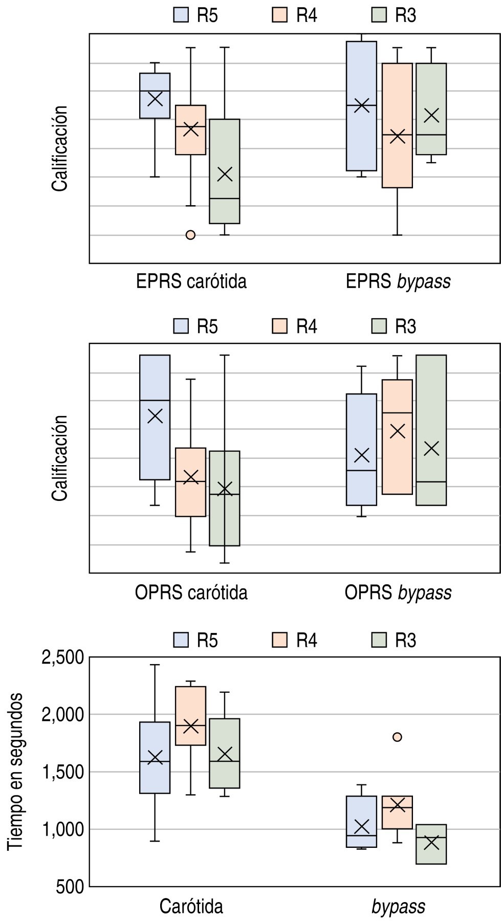 Los alumnos de quinto año mostraron mejores resultados de EPRS, tanto en ejercicios de carótidas como de derivación. El análisis OPRS mostró un mejor desempeño para los alumnos de quinto año en carótidas, pero no en bypass. Al analizar el tiempo, también vemos diferencias en función de la práctica como se ve en los gráficos. No hubo diferencias estadísticas entre los participantes según su etapa de entrenamiento en ninguna de las categorías estudiadas.