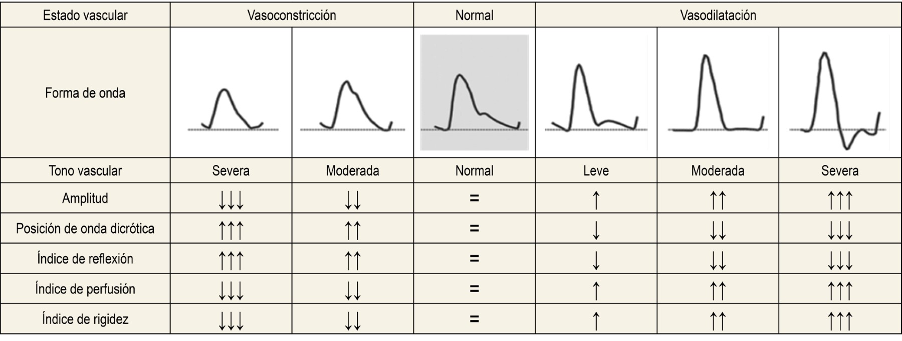La hipovolemia e hipervolemia, además de la hipotensión por vasodilatación, se asocian con alta mortalidad, por lo que es de gran relevancia clínica poder determinar el estado de volemia y el tono vascular para definir cuál es la estrategia de intervención adecuada para el paciente y la onda pletismográfica es una herramienta no invasiva a la cabecera del paciente. Las variaciones de dicha curva se observan en la Figura 1.