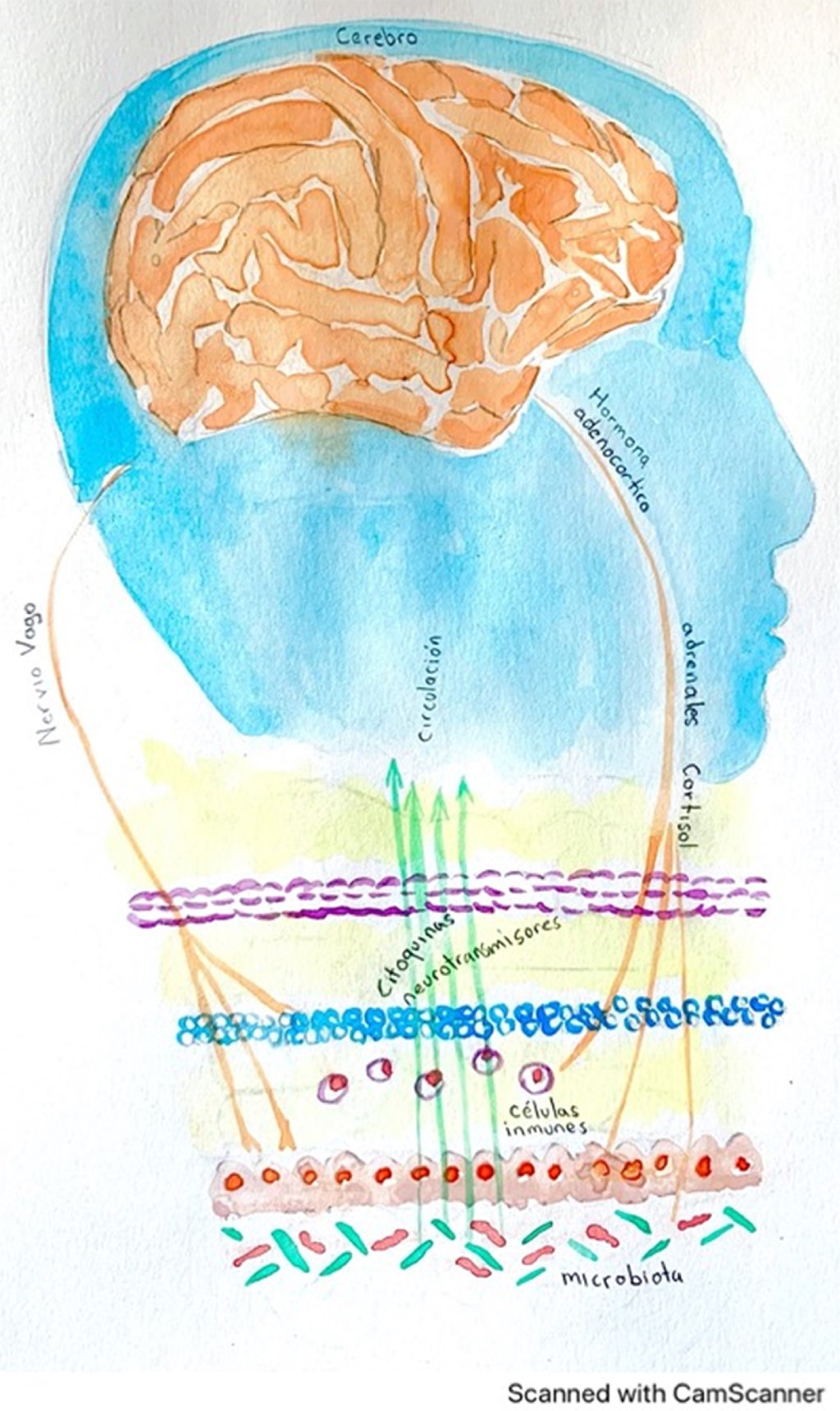 No es de sorprender que el tracto gastrointestinal sea el órgano más colonizado del cuerpo humano. Existen hasta 1012 células por gramo de contenido fecal en el colon. Aquí el huésped tiene la capacidad de reconocer a la microbiota a través de receptores específicos, llamados receptores de reconocimiento de patrones (RRP). La activación de éstos inicia una síntesis y liberación de citoquinas proinflamatorias. En un huésped crónicamente inflamado, la barrera mucosa pierde su continuidad, por lo tanto, permite una migración bacteriana y de citoquinas a la vía sistémica, lo cual no pasaría en una barrera íntegra. Al filtrarse estas moléculas a la vía sistémica, cruzan la barrera hematoencefálica, llegando así al SNC. Aquí activan el eje hipotálamo-hipófisis-adrenal (HPA) e inducen la liberación de cortisol(10).