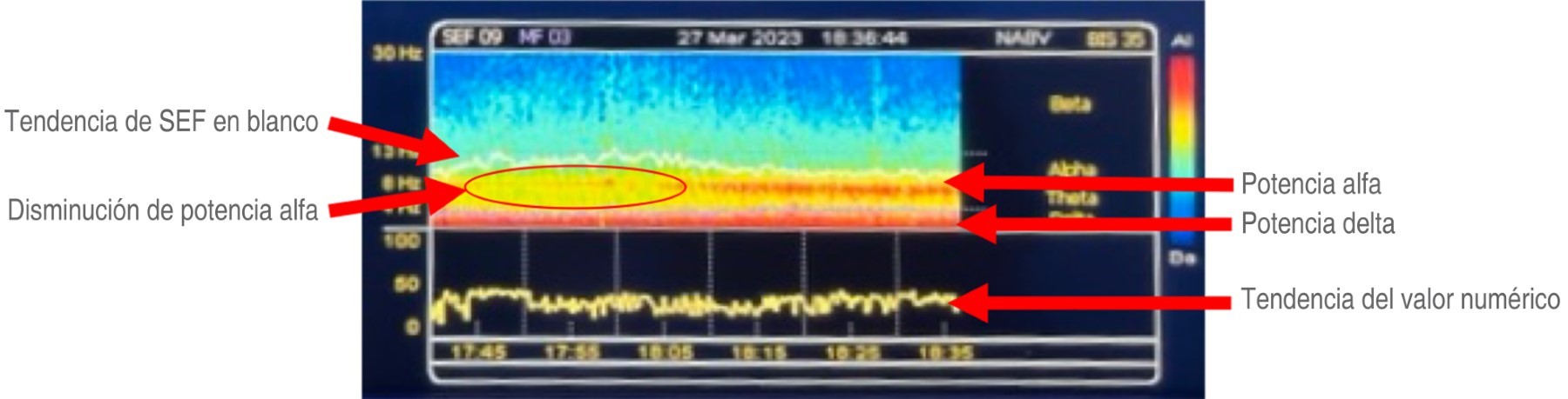 En el EEG intraoperatorio, el análisis y resumen promedio del trazo medido entre cinco y 15 minutos, se muestra en una onda con predominio de la frecuencia e intensidad, que genera un espectrograma del EEG izquierdo y derecho en el que se puede observar la tendencia de aumento de potencia de las ondas y en una línea roja la frecuencia del borde espectral 95 [spectral edge frequency 95 (SEF 95)], frecuencia por debajo de la cual se encuentra 95% de la potencia espectral. Un SEF 95 entre 12-14 Hz representa que 95% de la frecuencia de ondas está por debajo de 12-14 Hz, indicando que el paciente está en un adecuado estado de profundidad anestésica(19) (Figura 2). El análisis, conversión y descomposición de la señal en un espectro de colores según la frecuencia, amplitud, intensidad, potencia y su evolución en el tiempo se conoce como matriz de densidad espectral o density spectral array (DSA) en la cual, en algunos monitores, la tendencia del SEF 95 se muestra en una línea blanca(13) (Figuras 3 y 4).