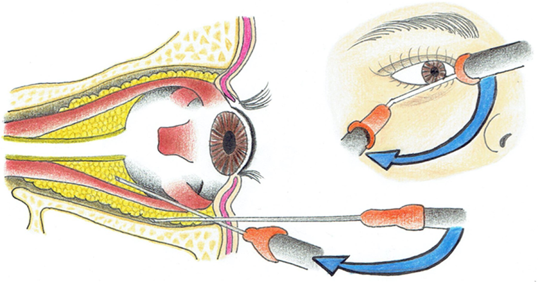 El bloqueo peribulbar, descrito por Davis y Mandel en 1986, fue desarrollado como una opción segura de bloqueo oftálmico, sin disminuir la calidad de la anestesia, el cual se realiza colocando la aguja en el espacio extraconal; por este motivo, el volumen de anestésico administrado debe ser mayor que en el bloqueo retrobulbar, para que pueda difundirse dentro del cono muscular y proporcionar una adecuada anestesia (Figura 2)(3).