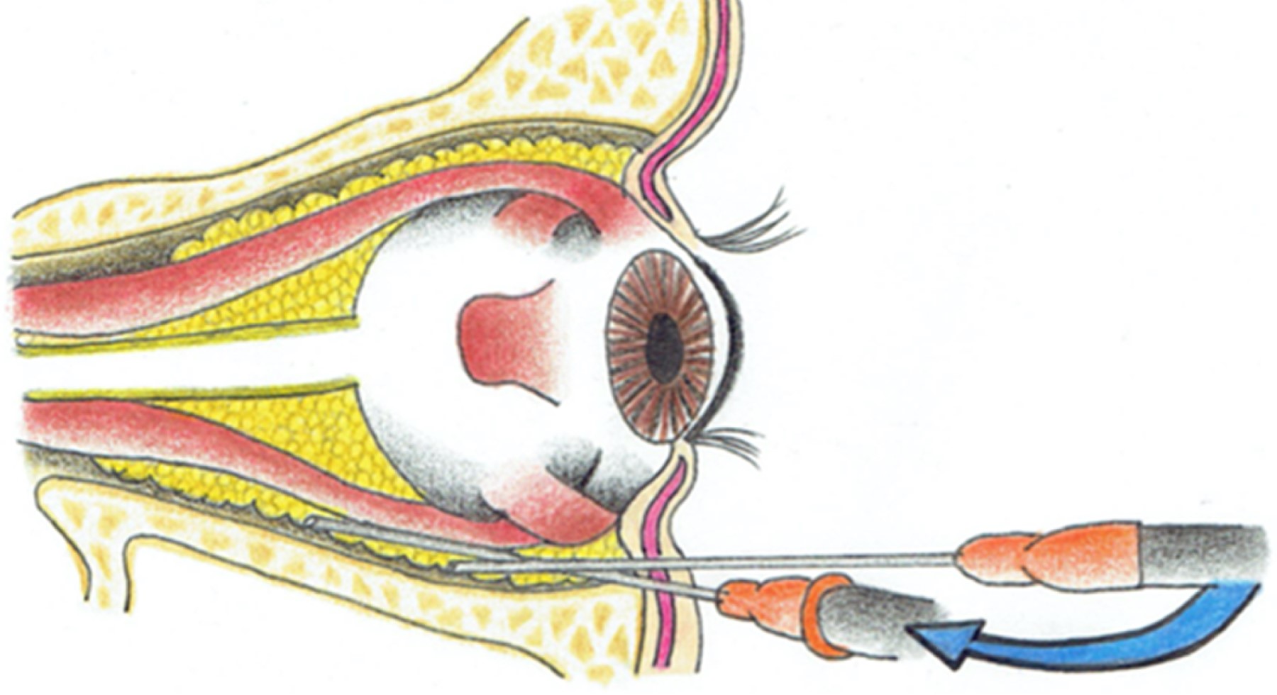 El bloqueo retrobulbar se caracteriza por la inyección de 3 a 5 mL de anestésico local dentro del espacio retrobulbar intraconal. Muchas estructuras importantes se localizan dentro del cono muscular, como son el nervio óptico (recubierto por las capas meníngeas), los vasos sanguíneos de la órbita, la inervación por el sistema nervioso autónomo, sensitiva y motora del globo ocular. En consecuencia, en el bloqueo retrobulbar la punta de la aguja se coloca cerca del nervio óptico y es razonable pensar que es posible la punción de la duramadre (Figura 1).