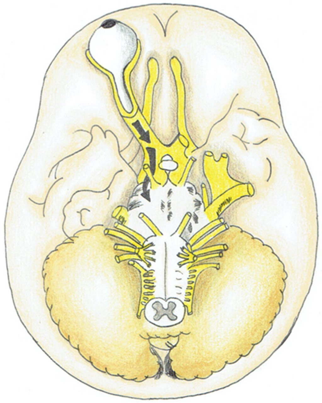 En un estudio realizado en cadáveres, se inyectó medio de contraste en la vaina del nervio óptico; posterior a esto, se realizaron estudios de imagen, los cuales demostraron que el medio de contraste se difundió a lo largo del espacio subaracnoideo, llegando hasta el mesencéfalo, el cual rodea una parte del centro respiratorio(8).