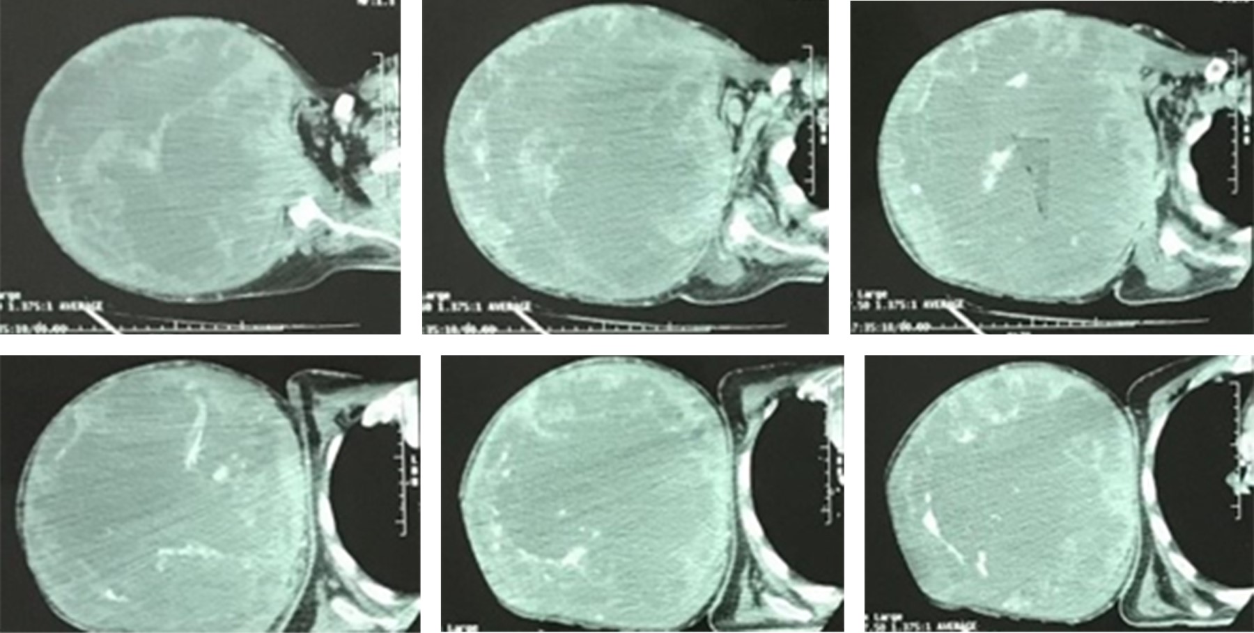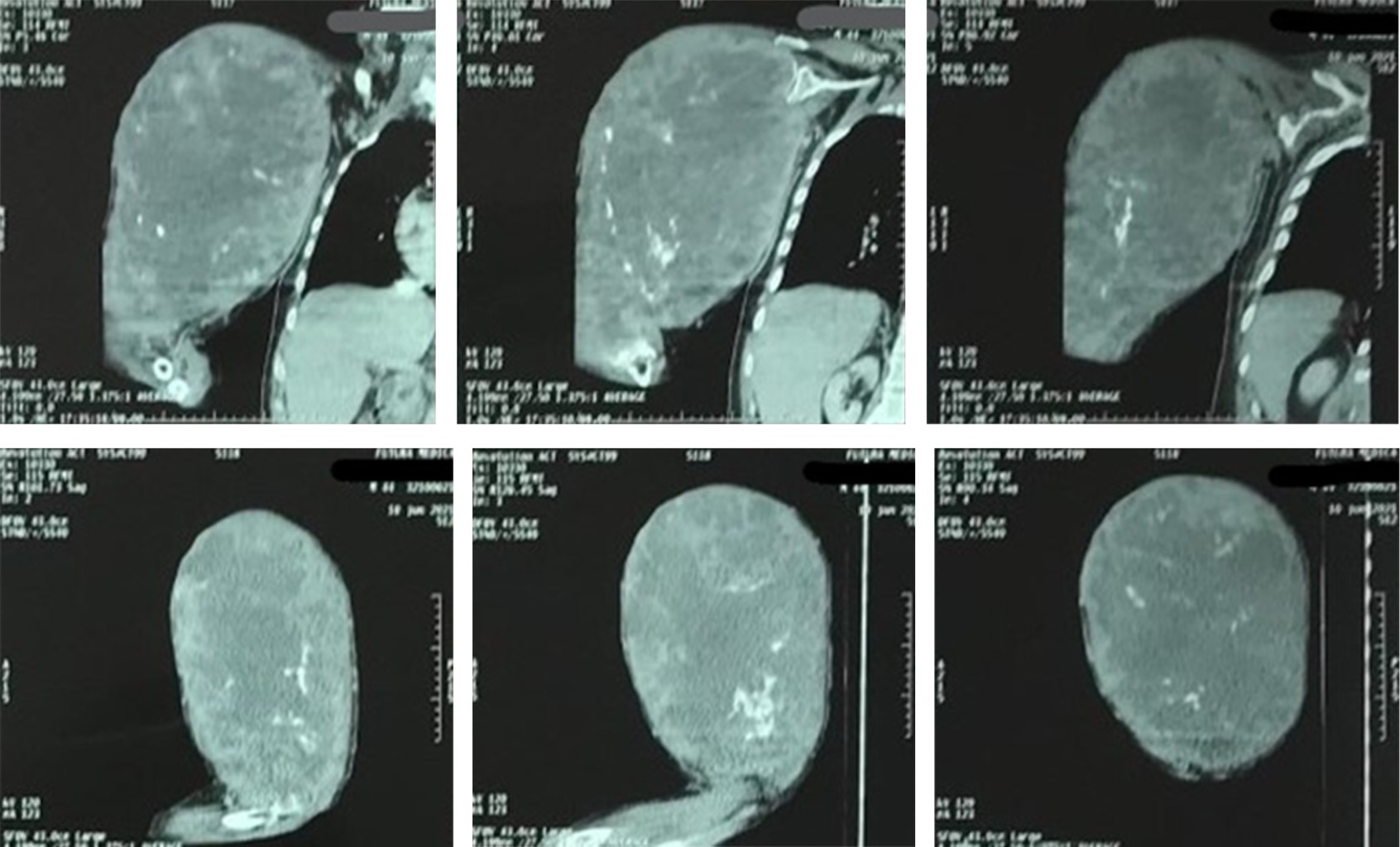 A la exploración física, consciente, orientado, cooperador, con palidez de piel y tegumentos +++. Cuello cilíndrico, móvil, tráquea central, Mallampati modificado II. Bellhouse-Dore: grado 1. Con tumoración de miembro torácico derecho de aproximadamente 30 × 40 cm, a tensión y con trama vascular aumentada, edematizada y dolorosa a la palpación y a la movilización, pulsos radial y cubital ipsilateral disminuido en intensidad. Resto sin alteraciones. Talla: 1.60 m. Peso: 58 kg. Peso predicho: 56.9 kg. Se anexa tomografía axial computarizada (Figuras 1 y 2).
